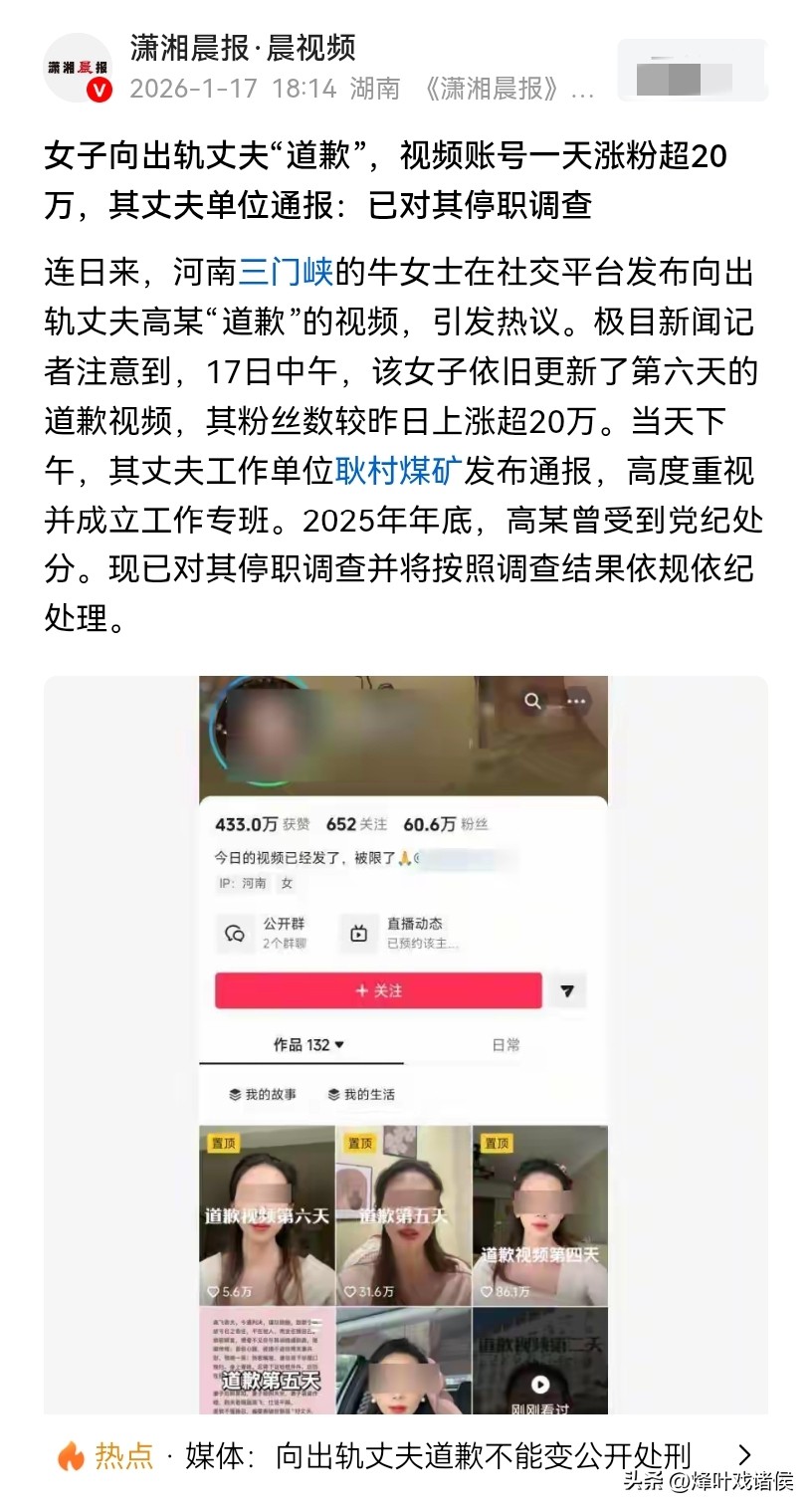 近日,一段女子向丈夫道歉的视频火了起来,粉丝每天以数万的数量在增加。