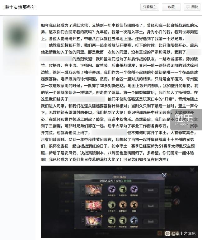 记录者史官发现更“新”的社区氛围“我也非常喜欢青春服,因为我可以在里面发挥经验,横扫天下,体验当大佬的感觉。”史官小曹对我说,她是一位新生代的《率土之滨》史官,2019年接触游戏,2020年以史官身份撰写了第一篇帖子,“开玩笑的,其实我是想说,从玩家角度来说,我是非常喜欢这种变化的,可以减少肝度和课金。”
