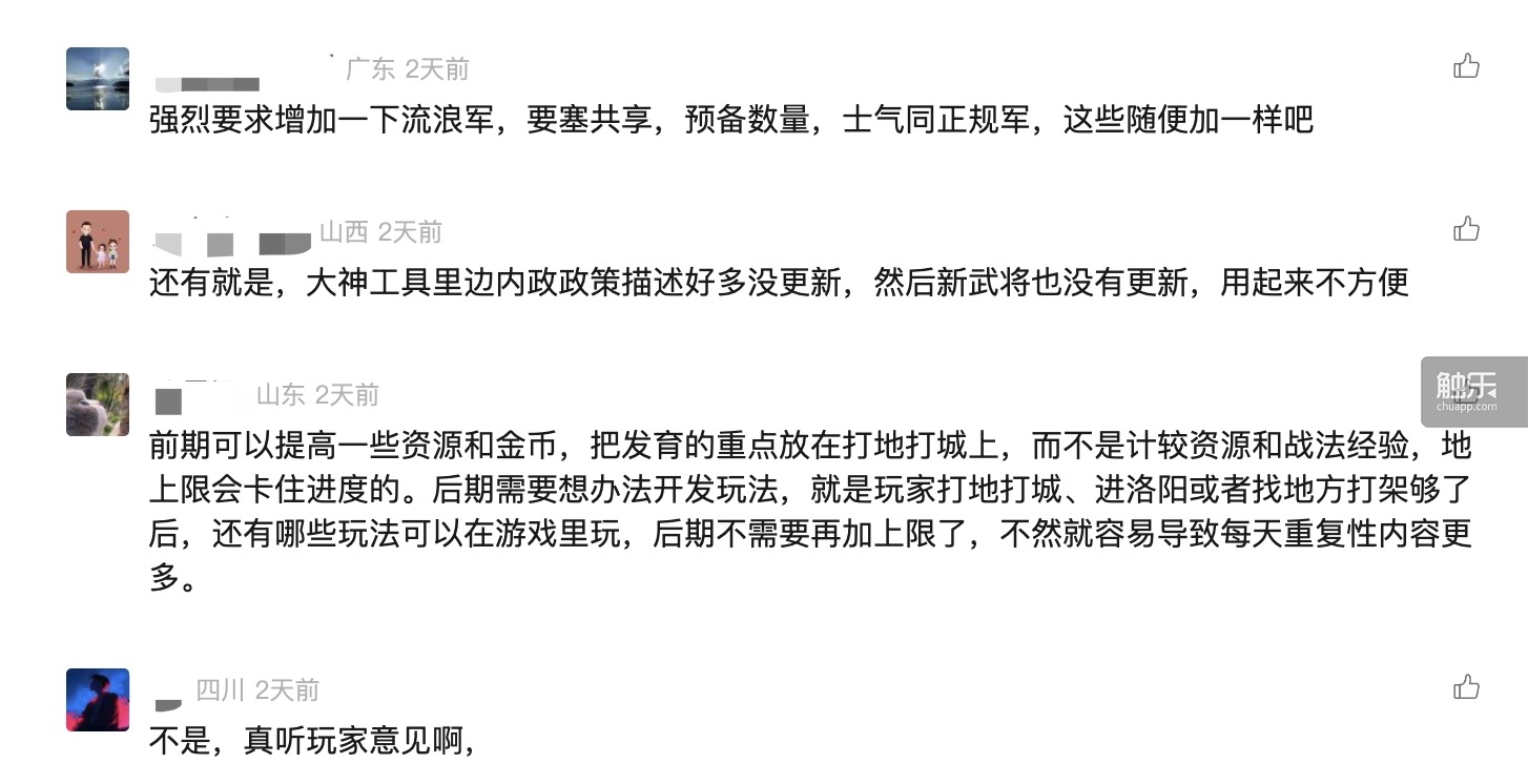 另外,它的“新”也体现在官方与玩家的互动上。最近《率土之滨》开通了策划问答专区,玩家的反馈都会得到回应,很多玩家调侃“策划听话得让人陌生”,“回归”。