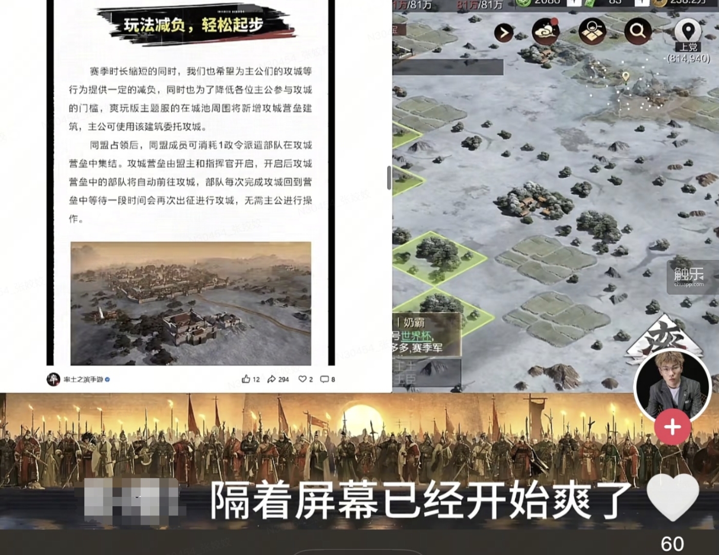 下一站了是《率土之滨》的7年老玩家。他在2018年接触这款游戏,2023年参加了官方的“星推计划”,成为一名视频创作者。最开始,他做得最多的是人物杂谈视频:初代顶流玩家“江山逼王”、开创了分五级的“牡丹令”的盟主“幽灵一现”、因“寿衣渡江”名震十三州的玩家仙狐等等,很多都是老玩家津津乐道,新玩家则需要一番补课的内容。与此同时,也有很多新故事和“名场面”不断出现,比如去年的祖孙三代玩“率土”、“率土教委”……这些东西在他看来都有意义,也值得被记录和进一步传播。