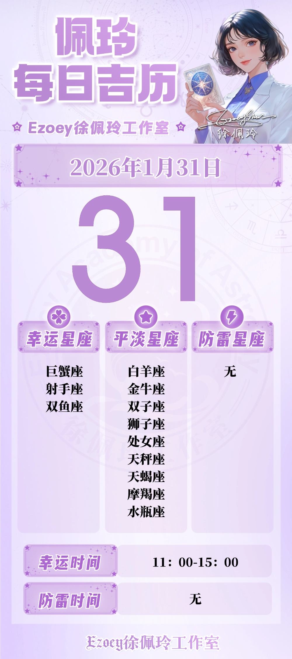 【1.31日播报】幸运提升日 幸运星座:巨蟹座、射手座、双鱼座——Ezoey徐佩玲26年星座播报