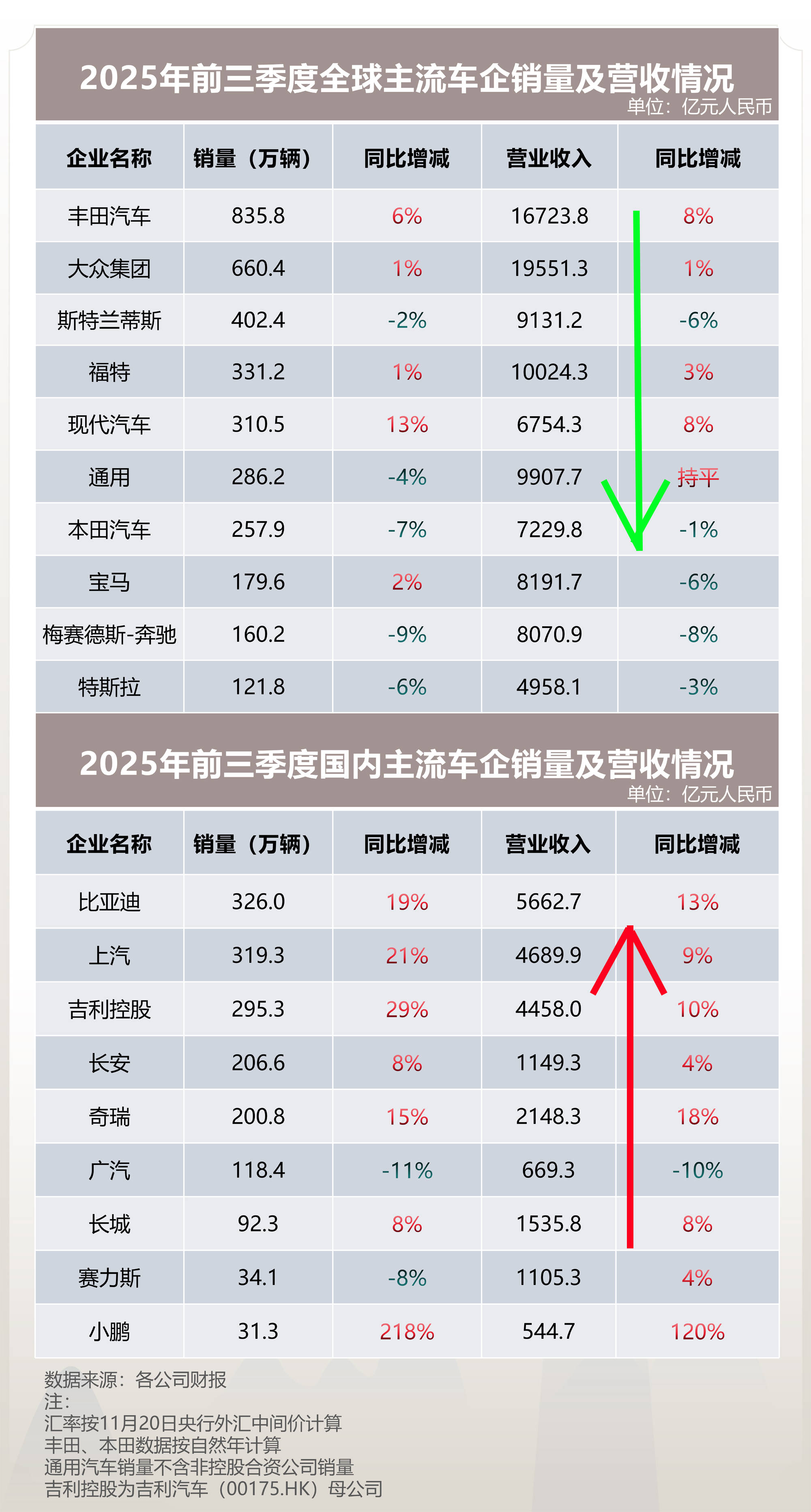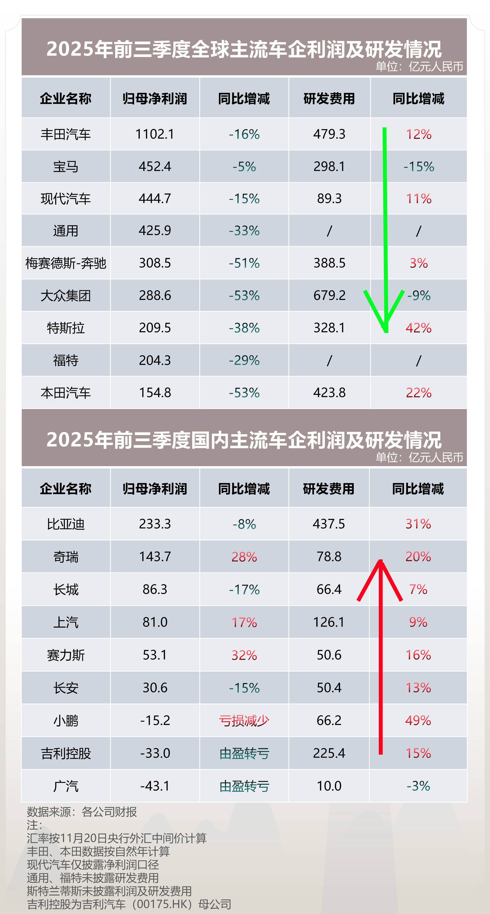 在盈利情况层面,奔驰、大众、本田利润降幅超50%,全球利润最高的丰田降幅也达16%。反观国内头部车企,比亚迪、奇瑞前三季度净利润均突破百亿元,展现出更强的盈利韧性,市场呈现出“东升西降”的态势。