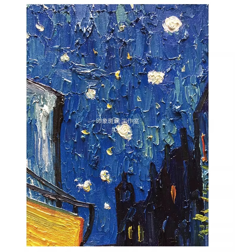 印象斑斓油画工作室孙老师这幅画不一样。他把那种色彩的呼吸感给画出来了。你看那片星空,不是平铺的蓝,是深邃的、带着紫罗兰调子的夜幕,星星不是点上去的,是“亮”出来的。那种光感,是透过颜料的缝隙透出来的,是手绘油画才有的温度。