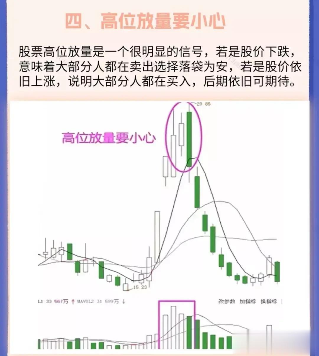 高位放量要小心:主力出货预警在股价涨到高位后,一旦放量就得警惕:放量下跌是大家都在卖,主力大概率在出货;就算股价还在涨,也是分歧变大,随时可能反转,绝对不能追高,要慢慢把钱落袋为安。
