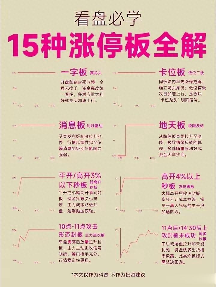 15种涨停板:看懂细节,提高胜率一字板是真龙头,资金高度一致;地天板是极致反转,大多靠消息;尾盘偷袭封板,多是资金骗散户接盘,次日很容易高开低走;卡位板是板块龙头信号,次日会加速,可重点关注。