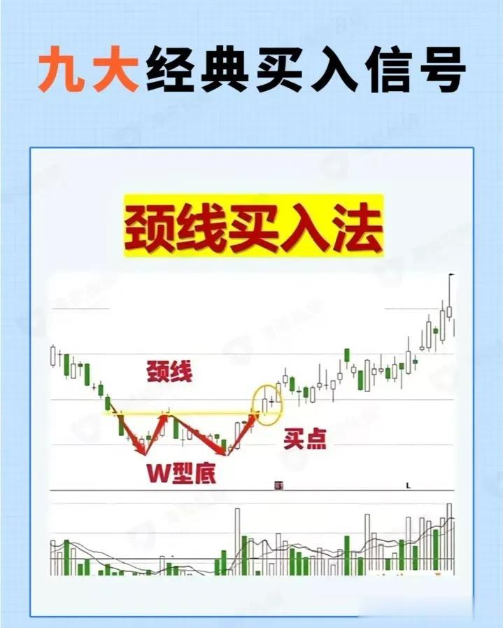 颈线买入法:W底突破的上车良机W底是经典的底部形态,当股价突破W底的颈线位时,就是明确的买点。这说明底部磨完了,想买的人开始发力,后续上涨行情开启,突破后回踩颈线,也是二次上车的好机会。
