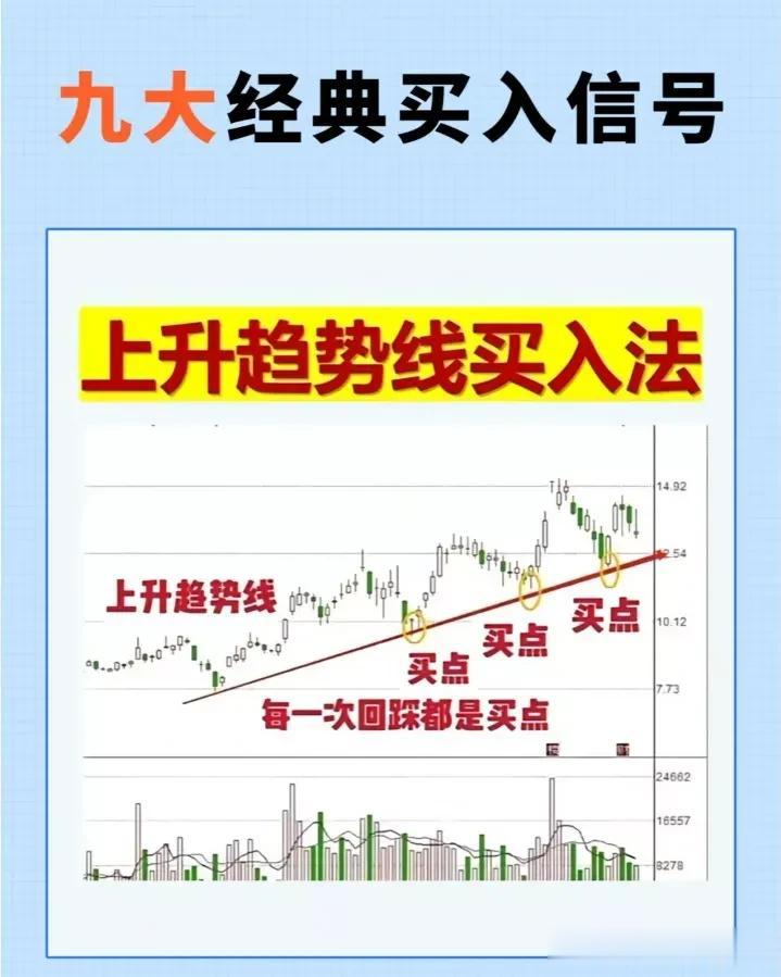 上升趋势线买入法:每次回踩都是机会你可以画一条连接股价低点的上升趋势线,在上升趋势里,股价每次回踩这条线,都是低吸的好机会。只要趋势线没被跌破,行情就会继续,不用追高,在回调时布局就行,适合做波段的人。