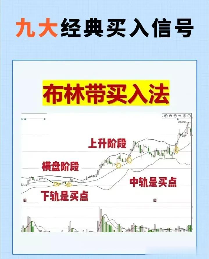 布林带买入法:不同阶段的精准买点布林带分上、中、下三条轨,横盘时股价回踩下轨是买点,上升时回踩中轨是买点。只要轨道向上,回踩中轨就是低吸良机,方法简单易懂,新手也能快速上手,不用复杂指标。
