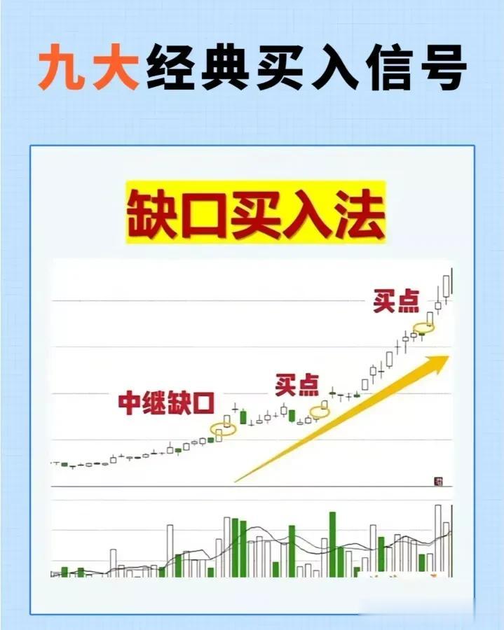 九大经典买入信号,缺口买入法:抓中继缺口的加速行情如果上涨过程中出现的跳空缺口(中继缺口),是行情要加速的信号。缺口出现后,股价会顺着趋势继续涨,每次回踩缺口附近都是买点,只要缺口没被补上,上升趋势就不会断,适合做趋势加速的投资者。
