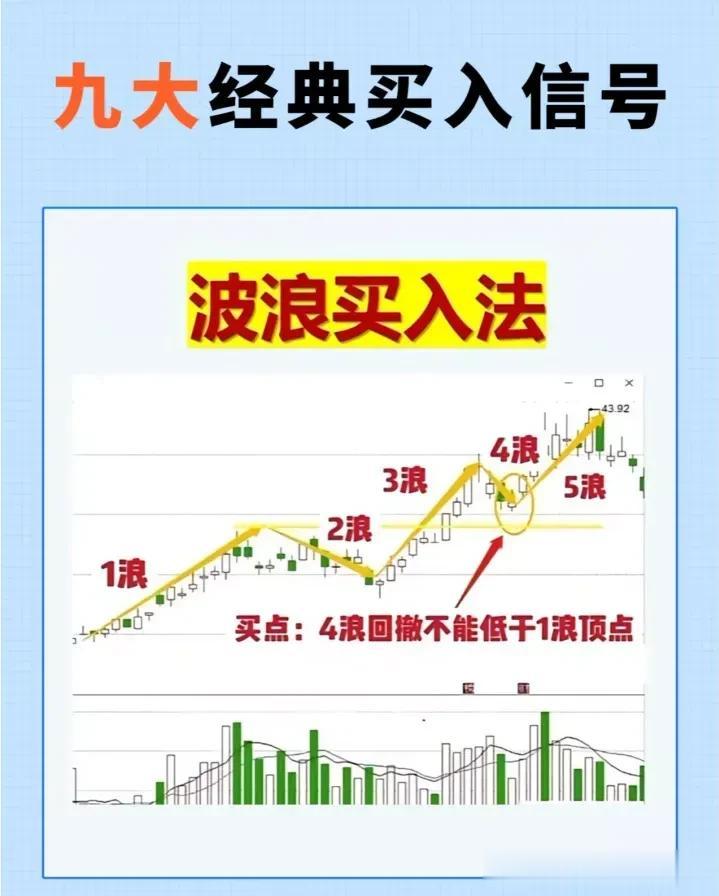 波浪买入法:抓4浪回踩的黄金买点一般而言,上涨分五浪,1浪涨、2浪调、3浪主升、4浪回踩、5浪冲顶。买点就在4浪回踩时,只要回踩没跌破1浪的高点,就说明上升趋势没坏,后续5浪上涨概率极大,这个位置进场,能稳稳吃到主升浪后半段。