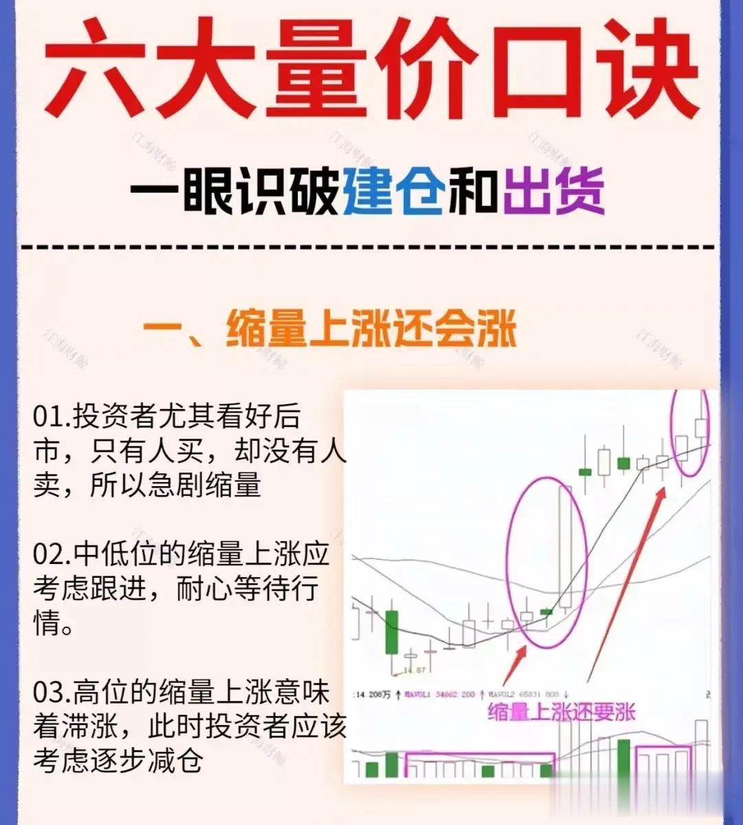 六大量价口诀:缩量上涨还会涨,位置不同操作不同很多人觉得上涨就得放量才健康,其实中低位缩量涨,是大家都看好后市、手里筹码不愿卖的信号,这时候可以跟进等行情;但高位缩量涨就是涨不动了,买盘没力,得慢慢减仓,别贪最后一口。