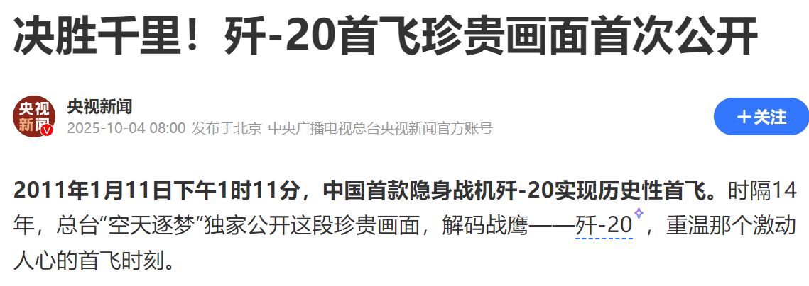 而歼-20战斗机在首飞14年之后,终于公布了首飞时的官方画面,这真的是非常的不同寻常。中国从来不会官宣最先进武器的存在,哪怕相关武器已经举世皆知也是如此,只有一款已经落后的武器才会被大肆报道。