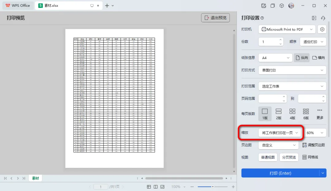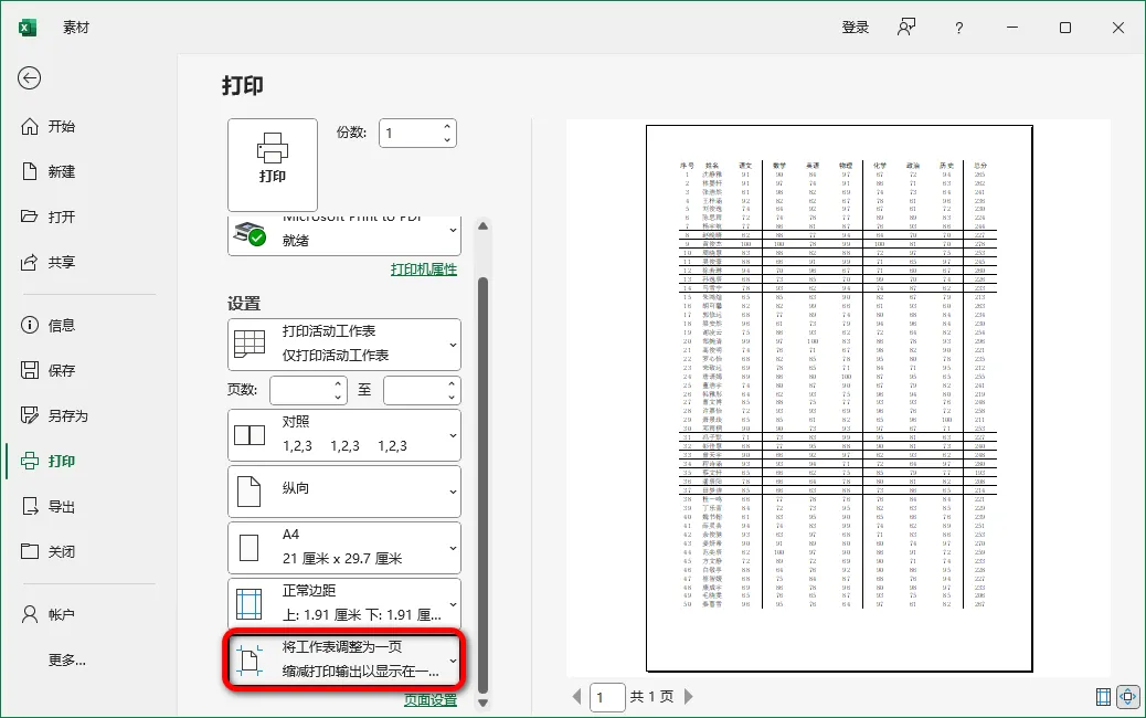 此时可以立即在预览界面看到调整后的效果,工作表已经智能缩放至一页。