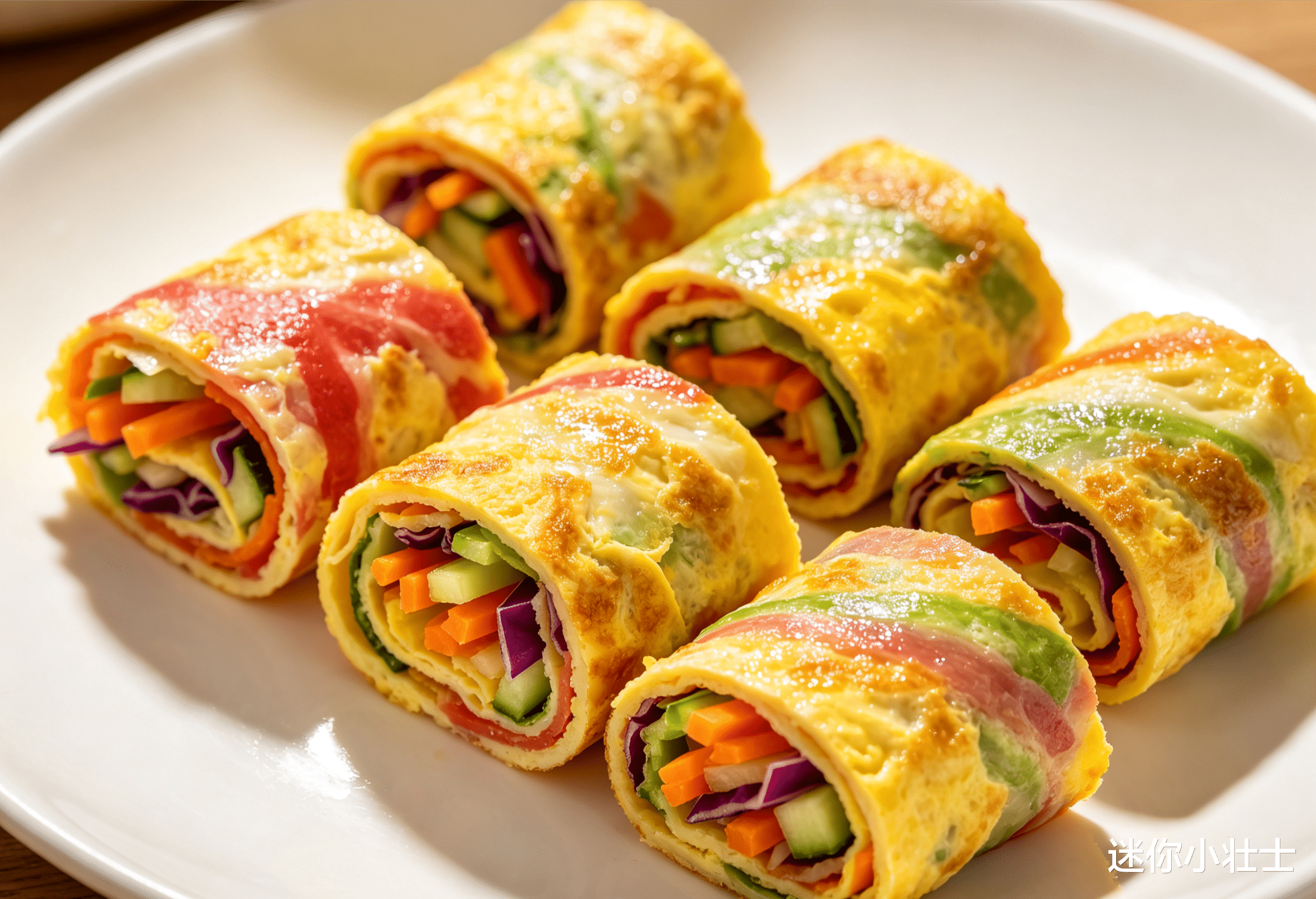 把蔬菜卷进蛋饼里,切成长条,颜值高、颜色好看,宝宝会主动伸手抓着吃。一边吃饭一边锻炼小手抓握能力,轻松改掉追喂、哄喂的坏习惯。