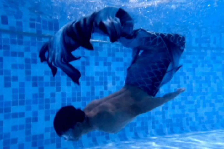 人鱼在浴缸里变回了原型,一米多长的鱼尾搭在浴缸边。