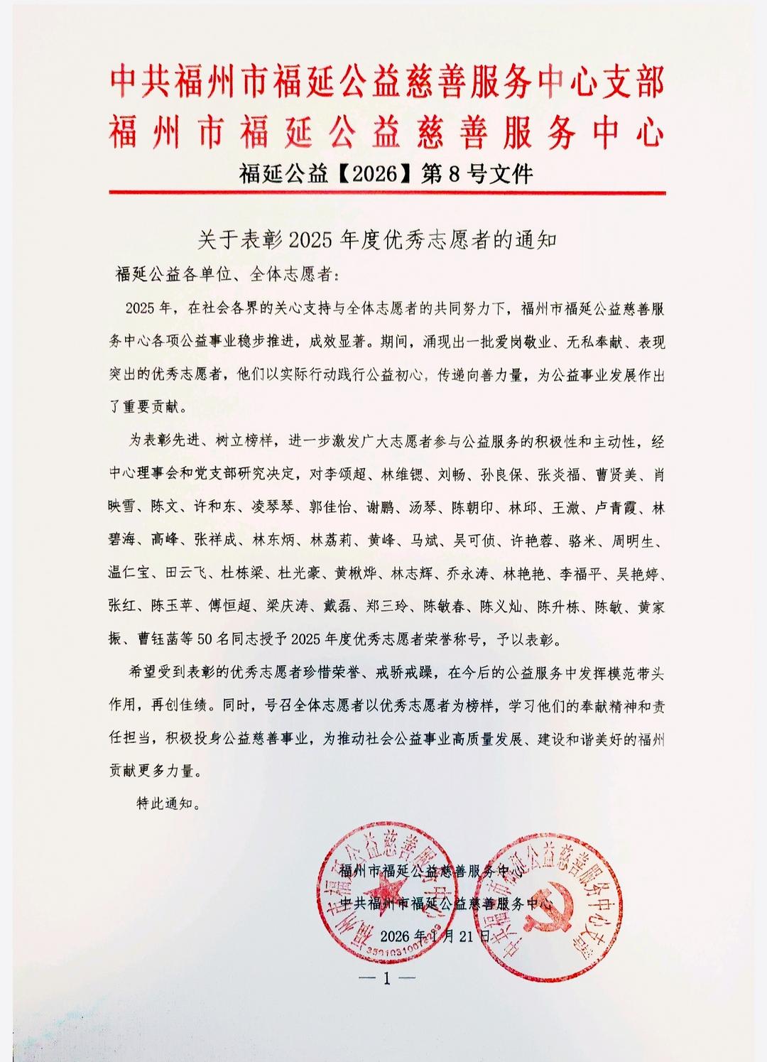 有一种力量,于无声处浸润人心;有一种担当,以平凡之举书写不凡。2026年1月21日,福州市福延公益慈善服务中心联合中共福州市福延公益慈善服务中心支部正式发布表彰通报,授予李颂超、乔永涛、傅恒超、马斌等50名同志“2025年度优秀志愿者”荣誉称号,向这群深耕公益、践行初心的践行者们,致以最崇高的敬意。