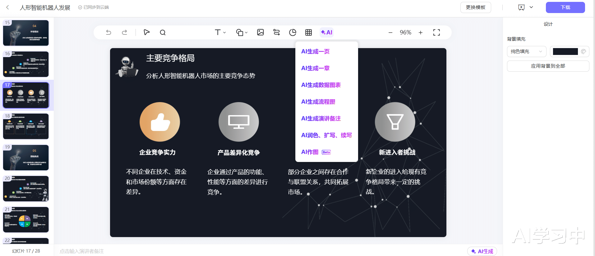 - 内容优化:“AI生成一页”可对任意单页进行重写或扩写。