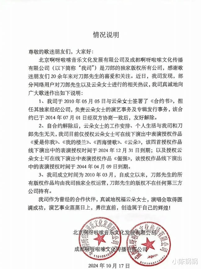 这一切始于著名词作人苏柳的一次公开采访。她坚称自己拥有《我的楼兰》100%的词作权,且版权始终掌握在自己手中。而在此之前,刀郎所属的经纪公司已收回了歌手云朵对《我的楼兰》《云朵》《西海情歌》等歌曲的公开演唱权,自2024年12月31日起生效。