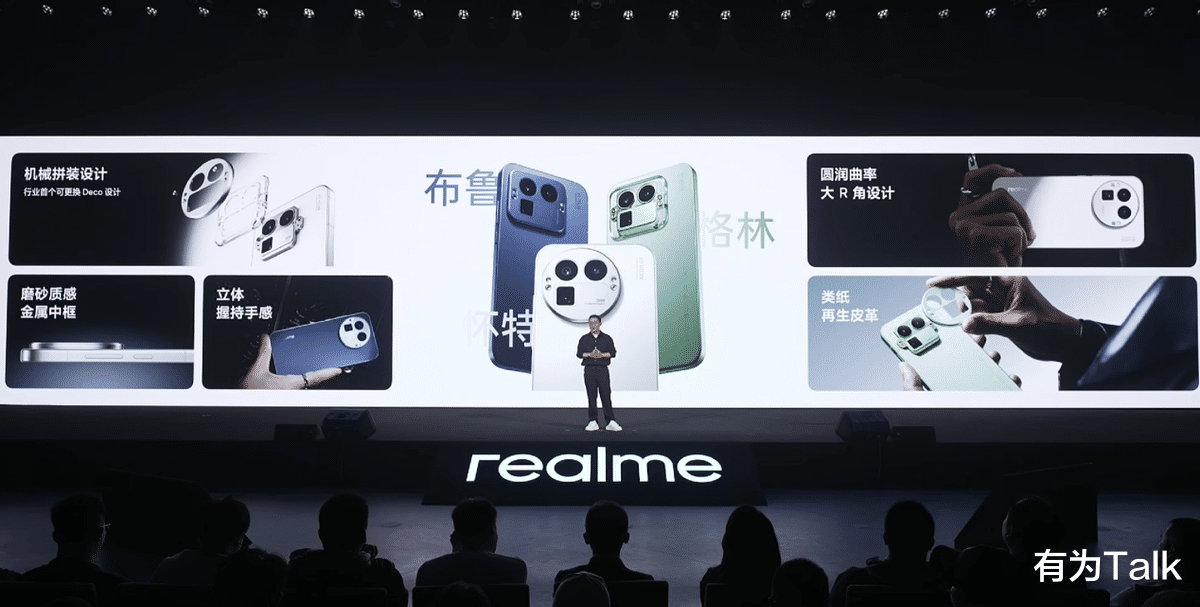 真我GT8 Pro行业首创机械拼装设计,基于模块化机械设计美学,将后置镜头模组从一个固定的整体,变为一个可自由切换成机能罗伯特、经典圆形、透明魔方、金属舷窗四种形态的精密模块。除了颠覆性的Deco设计创新,真我GT8 Pro机身上每一处细节都彰显出旗舰质感。采用全新AG工艺的“怀特”,机身整体纯白素雅,材质是触感如丝般顺滑的AG磨砂玻璃。蓝色的“布鲁”和绿色的“格林”,则是全新的类纸再生皮革,其基底由回收的纸张与涤纶制成,配合坚固的哑光金属中框与流线型大R角,共同打造温润贴合的握持手感。