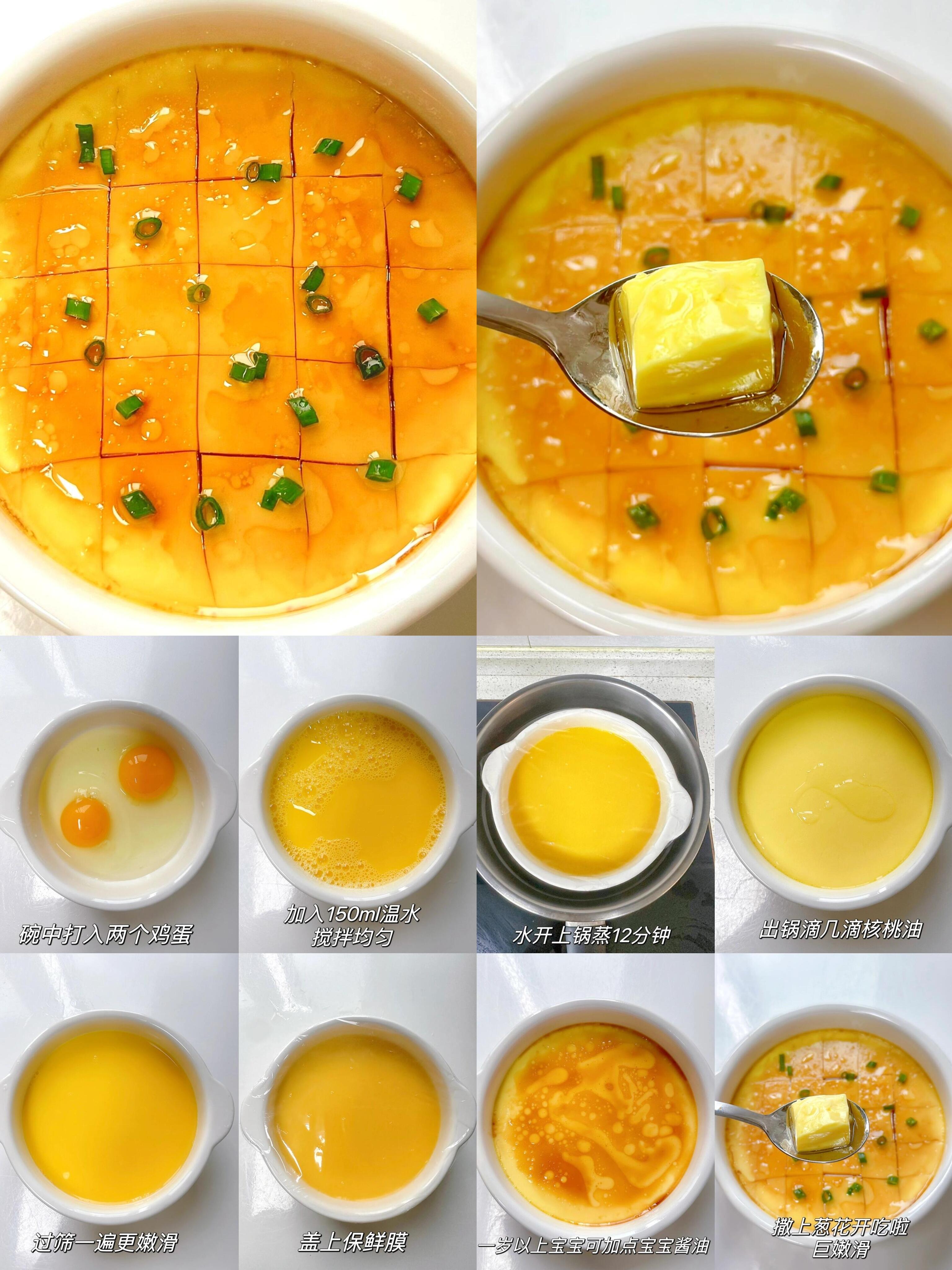 • 做法:准备三个鸡蛋,加开水至1/2碗,筷子搅拌3分钟,用勺子撇去浮沫,蒸锅水烧开,蛋羹碗盖一个小盘子,蒸12分钟焖2分钟,出锅划方格,加一勺半酱油,撒葱花即可。