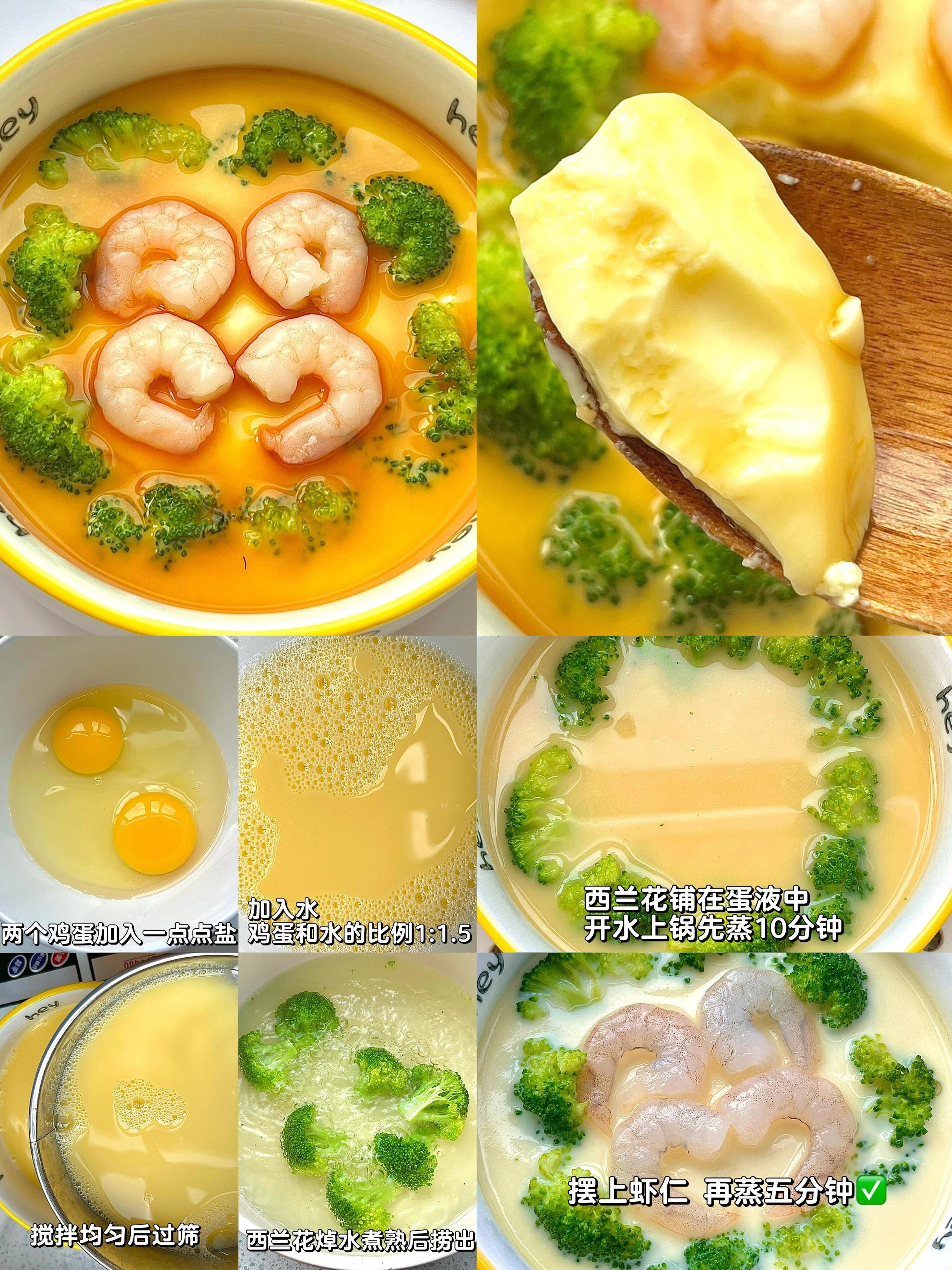 • 做法:两个鸡蛋加入一点点盐,加入水(鸡蛋和水的比例1:1.5),搅拌均匀后过筛,西兰花焯水煮熟后捞出,铺在蛋液中,开水上锅先蒸10分钟,摆上虾仁,再蒸五分钟即可。