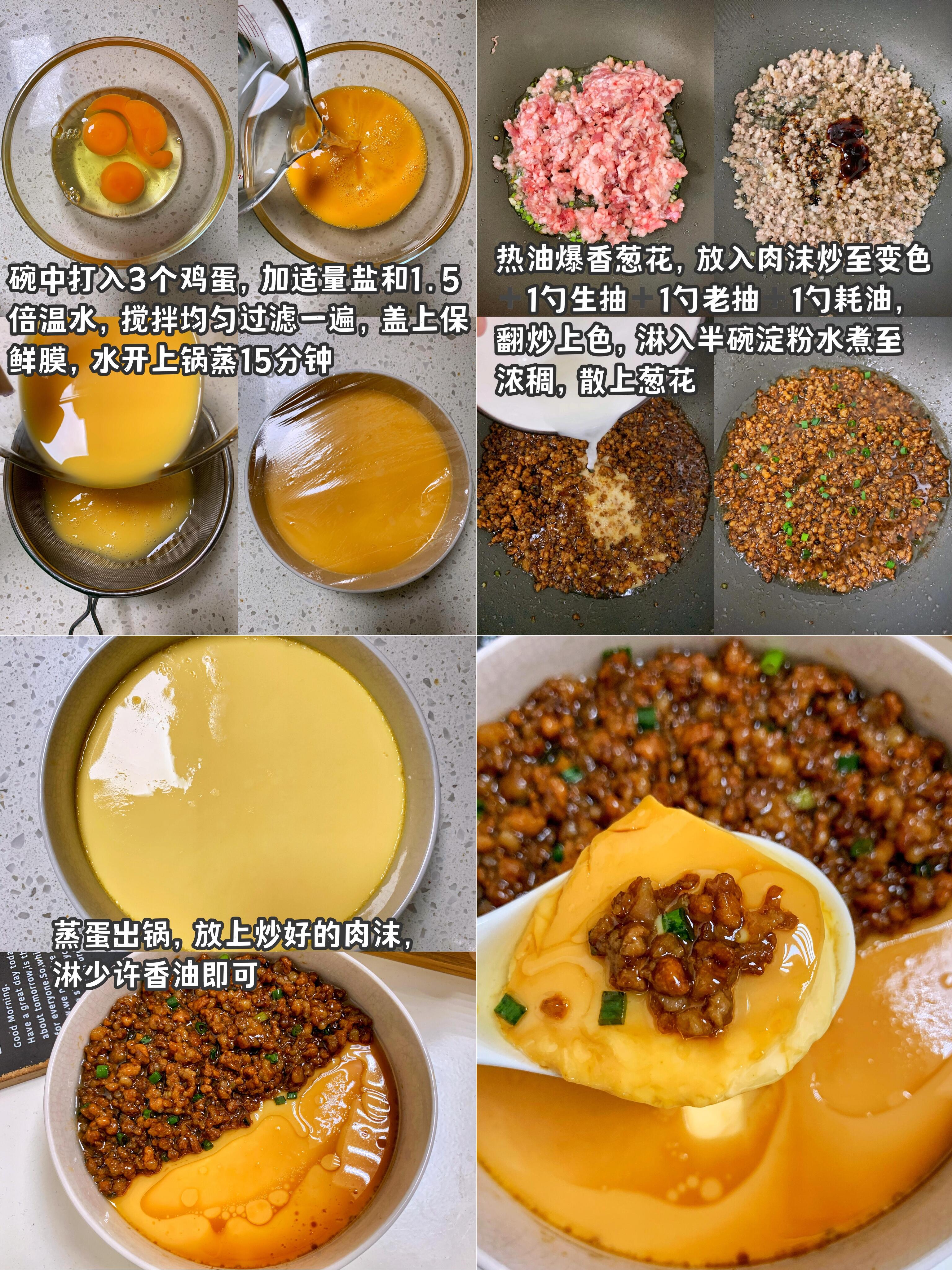 • 做法:碗中打入3个鸡蛋,加适量盐和1.5倍温水,搅拌均匀过滤一遍,盖上保鲜膜,水开上锅蒸15分钟,热油爆香葱花,放入肉沫炒至变色,加1勺生抽、1勺老抽、1勺蚝油,翻炒上色,淋入半碗淀粉水煮至浓稠,散上葱花,蒸蛋出锅,放上炒好的肉沫,淋少许香油即可。
