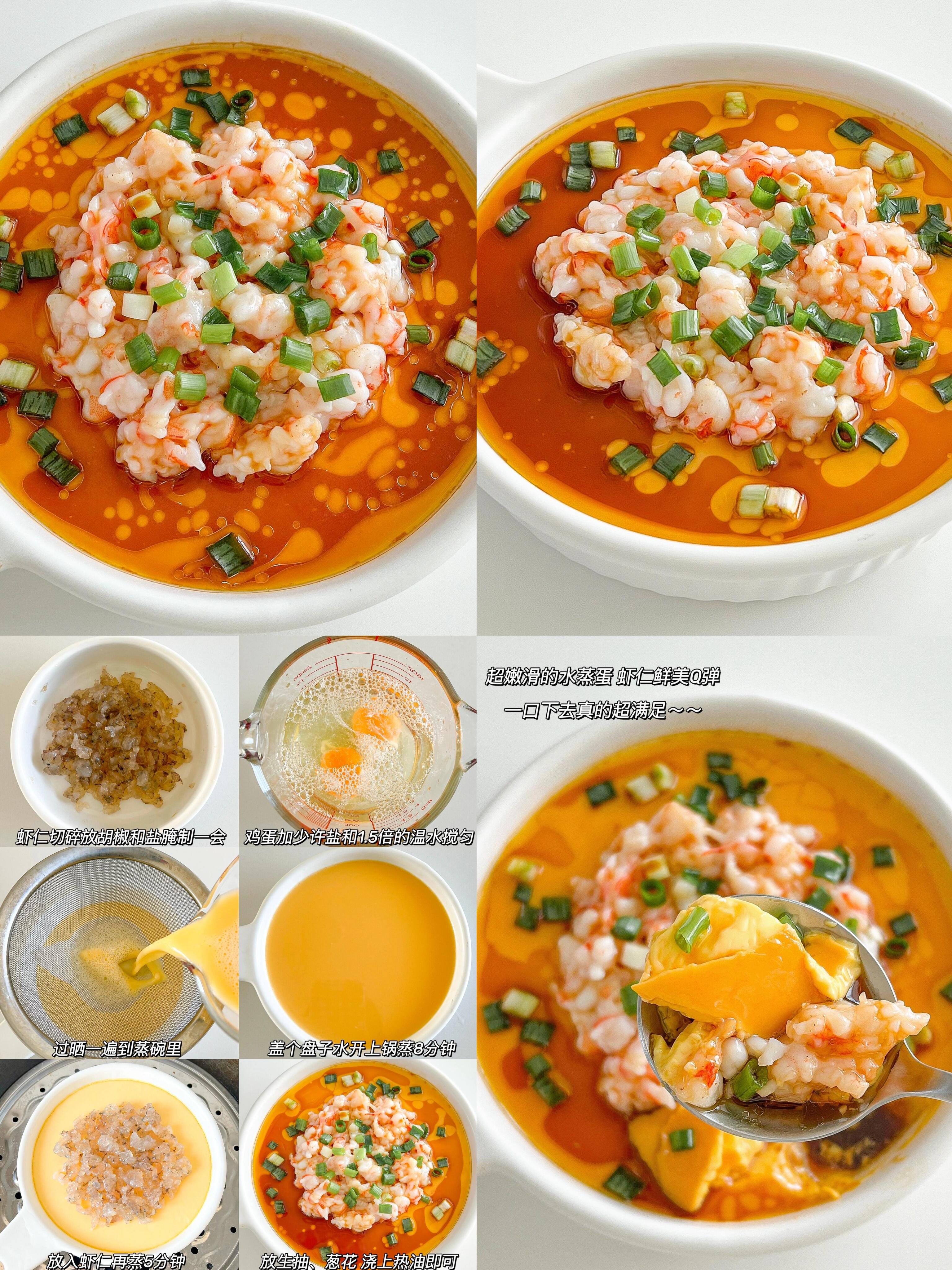 • 做法:虾仁切碎放胡椒和盐腌制一会,鸡蛋加少许盐和1.5倍的温水搅匀,过筛一遍到蒸碗里,盖个盘子水开上锅蒸8分钟,放入虾仁再蒸5分钟,放生抽、葱花,浇上热油即可。