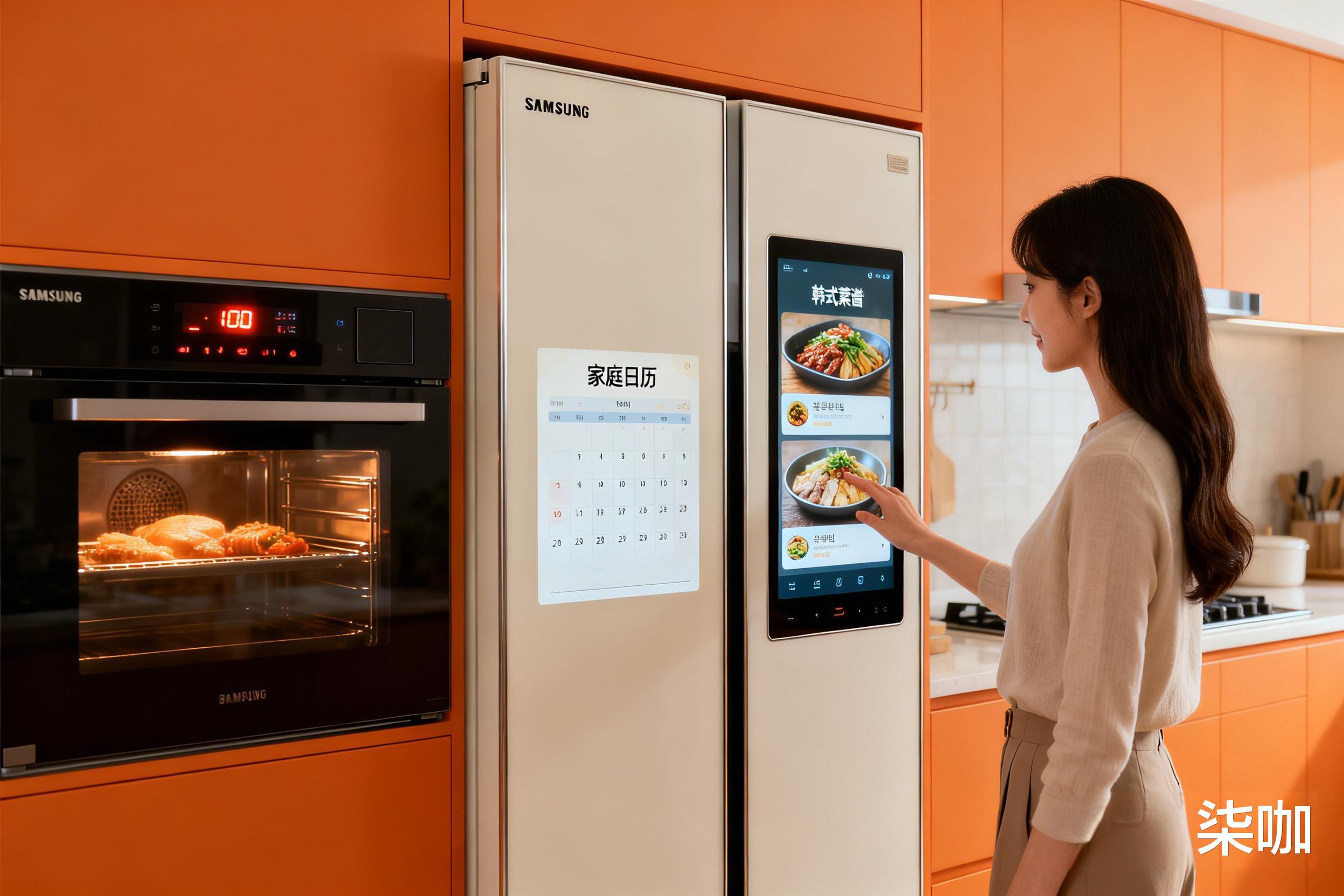 同一时间,首尔的厨房里,冰箱大屏自己就推送出菜单,还和烤箱联动着预热,家庭日程也准时弹出来了。