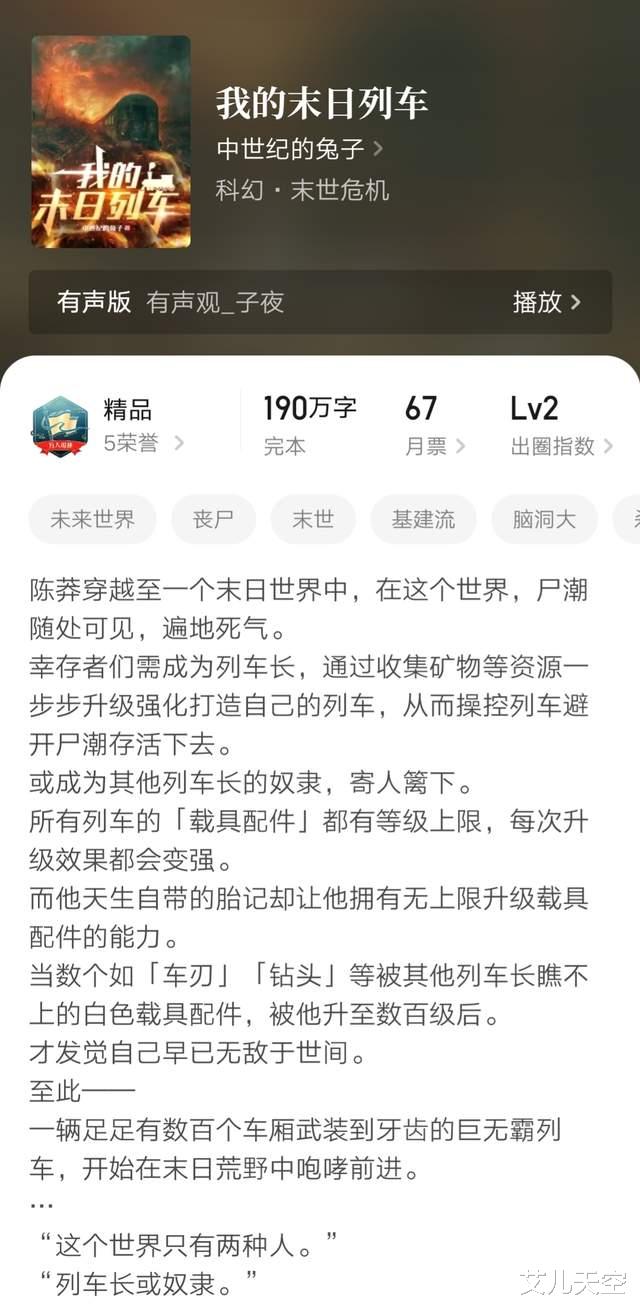 末日列车这本,主角穿越末日世界成了一个列车上的奴隶,随着对周围的熟悉,他才了解到,在这个末日世界生存,要么拥有自己的列车,要么就成为列车上的奴隶,只有列车才能应对各种危险。列车也有等级,越高级,越强大。