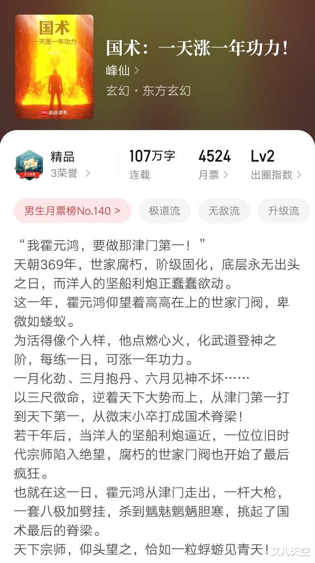 今天又看到两本小说万订了,一本是在昨晚达成的老书,一本是正在连载的作品,简单更大家一起看看。1、《国术:一天涨一年功力!