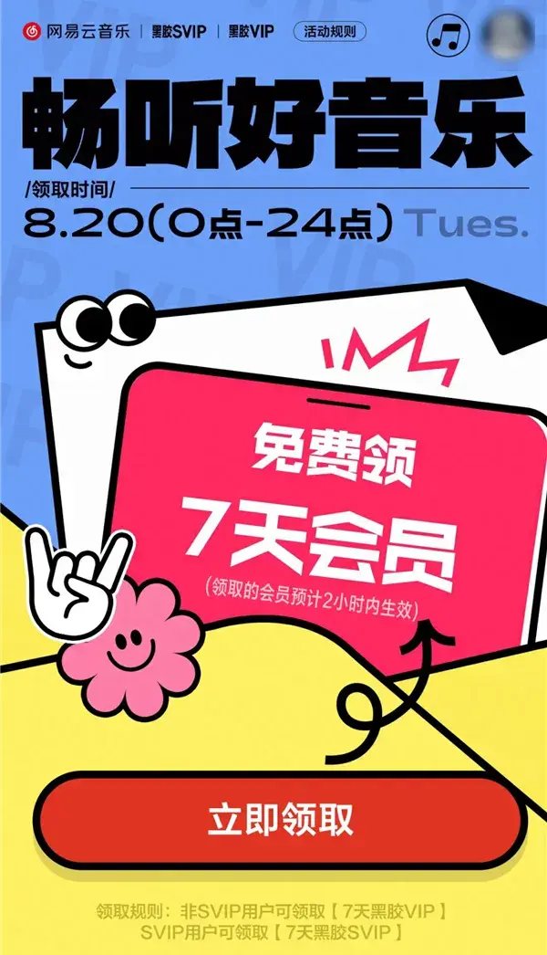 活动规则显示,非会员和畅听会员用户可免费领取7天黑胶VIP,原有网易云音乐SVIP在期用户、黑胶VIP在期用户则直接在原剩余有效期时长上叠加。