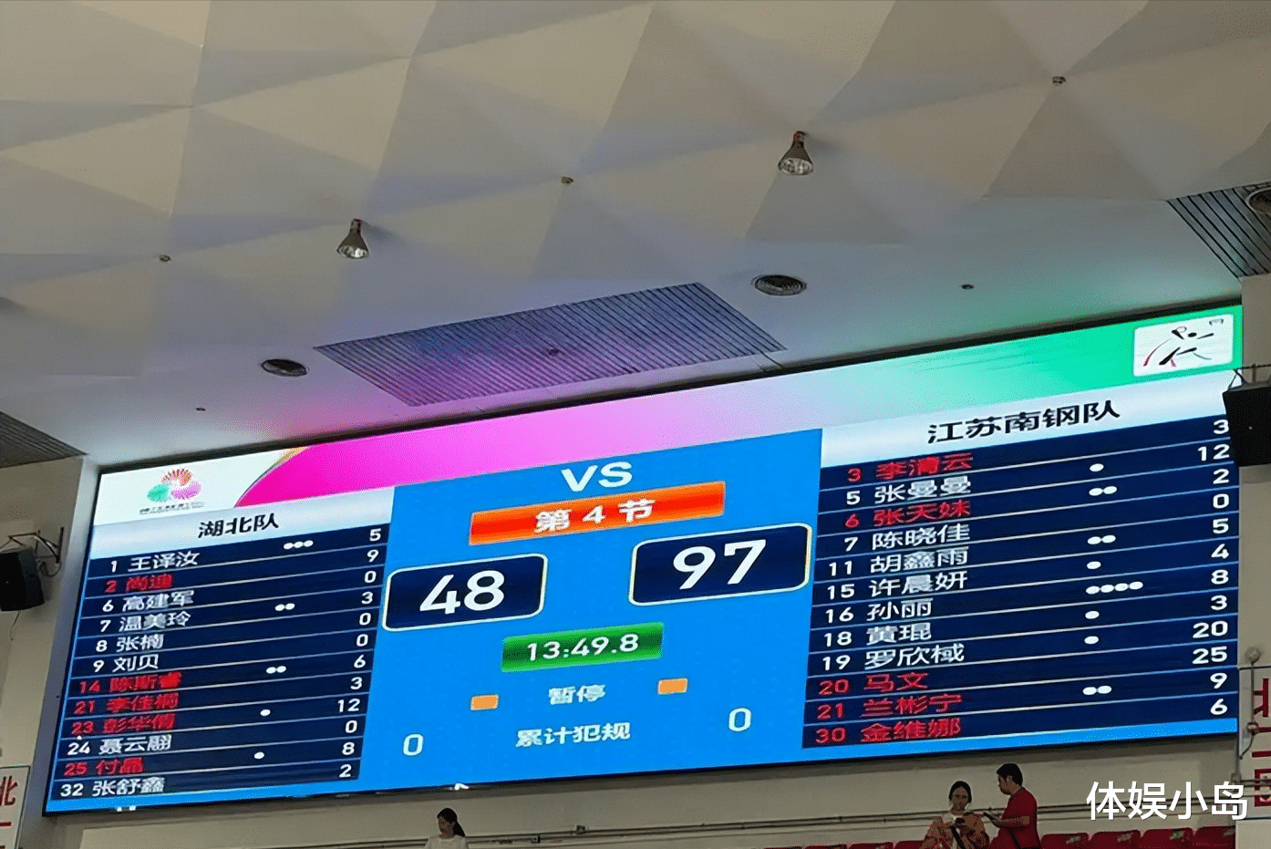 另一场比赛江苏队97比48大胜湖北队晋级四强,也是一支强队。湖北队只有彭华倩得分上双,她得到12分4篮板,付晶8分4篮板6助攻。江苏队阵容强大,国手罗欣棫打了17分钟就得到20分11篮板,张曼曼12分2助攻,马文25分6篮板,金维娜6分,许晨妍只打了5分钟得到4分5篮板,主动卸任主帅专职球员的38岁老将陈晓佳也打了6分钟没有得分进账收获2篮板2助攻。胡鑫雨5分8助攻4抢断4篮板,李清云3分9篮板。
