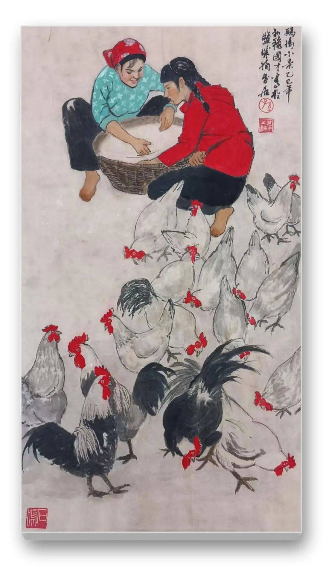 笔墨是画家的语言,孙国才用这份语言,为高原烟火谱了一曲赞歌。他的水墨晕染温润如水,芭蕉叶的浓淡层次,鸡群羽毛的墨色变化,既有国画写意的灵动,又不失写实的鲜活;线条勾勒简洁有力,农妇的衣饰轮廓、木栅栏的纹路,用线或粗或细,精准地勾勒出不同物象的质感——粗线是山石的沉稳,细线是发丝的柔软,每一笔都在诠释着高原的肌理。色彩的运用更是巧妙,粉、紫、蓝等亮色点缀在素朴的画面中,像高原上的野花,既点亮了视觉,又不破坏乡土的本真;少数民族服饰的绚烂色彩,与背景的水墨色调相融,让传统笔墨与高原生活达成了完美的平衡,让每一笔色彩都成为传递情感的载体。