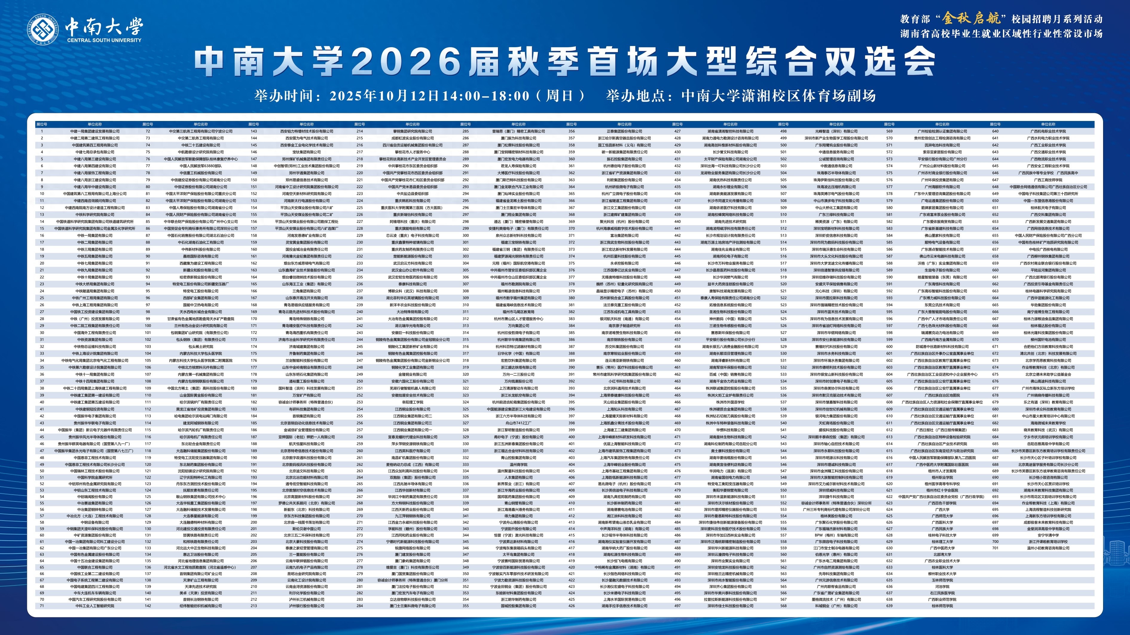 从双选会核心信息来看,时间定在2025年10月12日14:00至18:00,地点位于中南大学潇湘校区体育场副场。