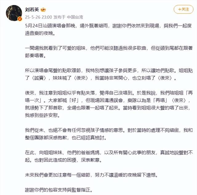 到了这一步,刘若英出面道歉了。