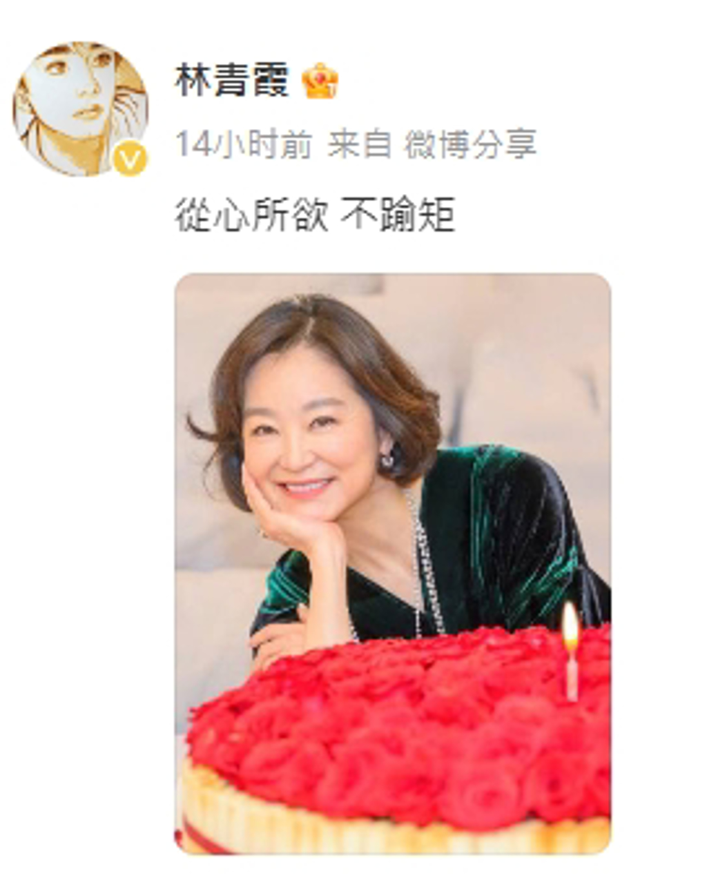 林青霞在今(4)日凌晨4点左右在微博分享庆生美照,照片中她穿着绿色天鹅绒礼服,戴着项链和耳环,桌上摆着巨大玫瑰花蛋糕,手托在下巴露出自信招牌笑容,气色红润,冻龄外貌美出新高度,她配文写下:「从心所欲,不逾矩」。