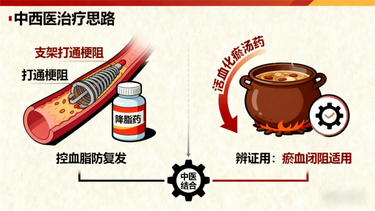 三、中西医应对,别搞混 “重点”错误做法:•西医:觉得 “支架能一劳永逸”,术后不控血脂;