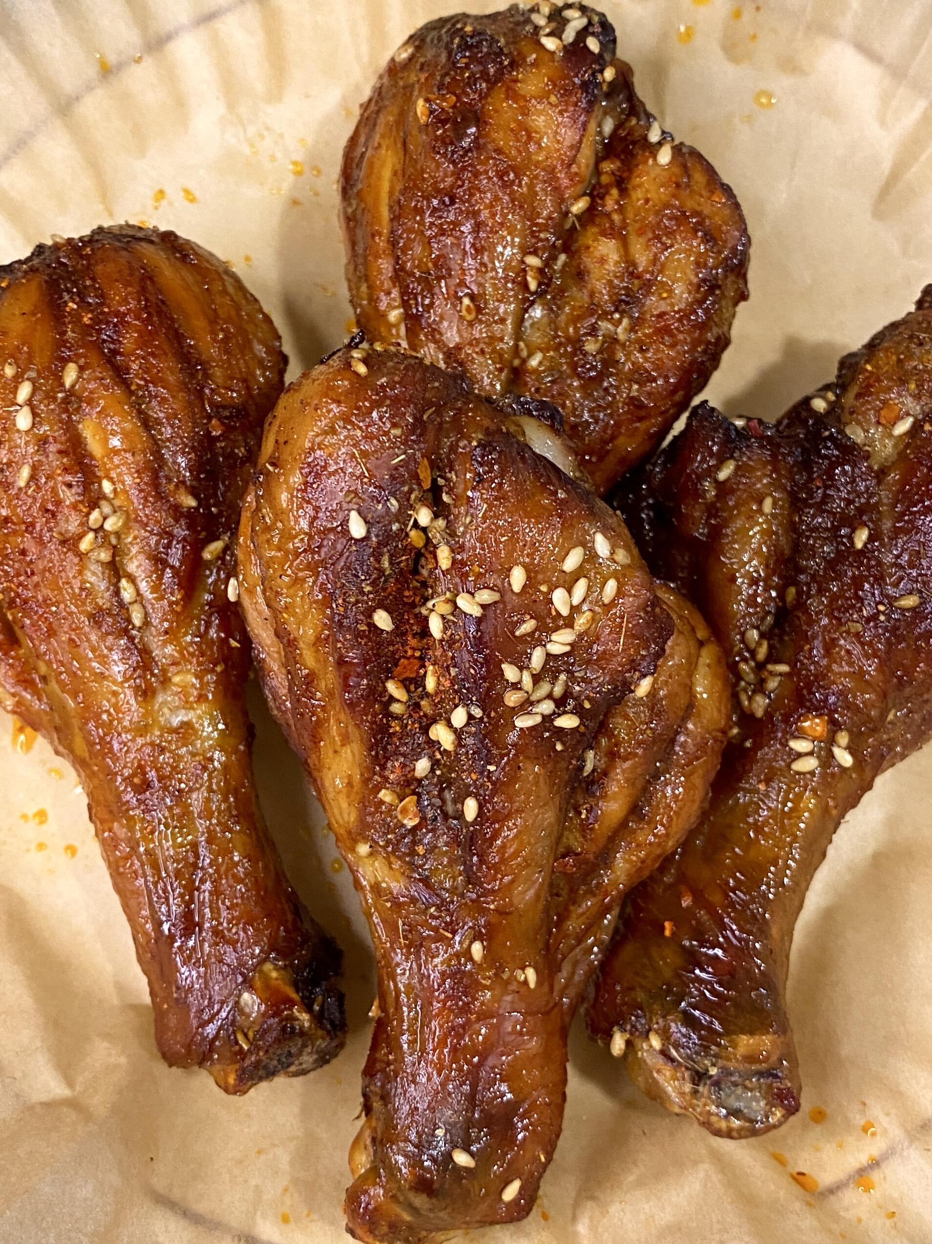 经过这8分钟的烤制,鸡腿已经基本熟了,但还没达到最美味的程度。这时候,在鸡腿表面撒上一些芝麻、辣椒粉和孜然粉,这些调料就像魔法一样,瞬间提升了鸡腿的香味。芝麻增加了香气和口感,辣椒粉带来一丝辣味,孜然粉则赋予了鸡腿独特的风味。撒好调料后,再把鸡腿放入空气炸锅中烤5分钟,让调料的味道充分融入鸡腿里。