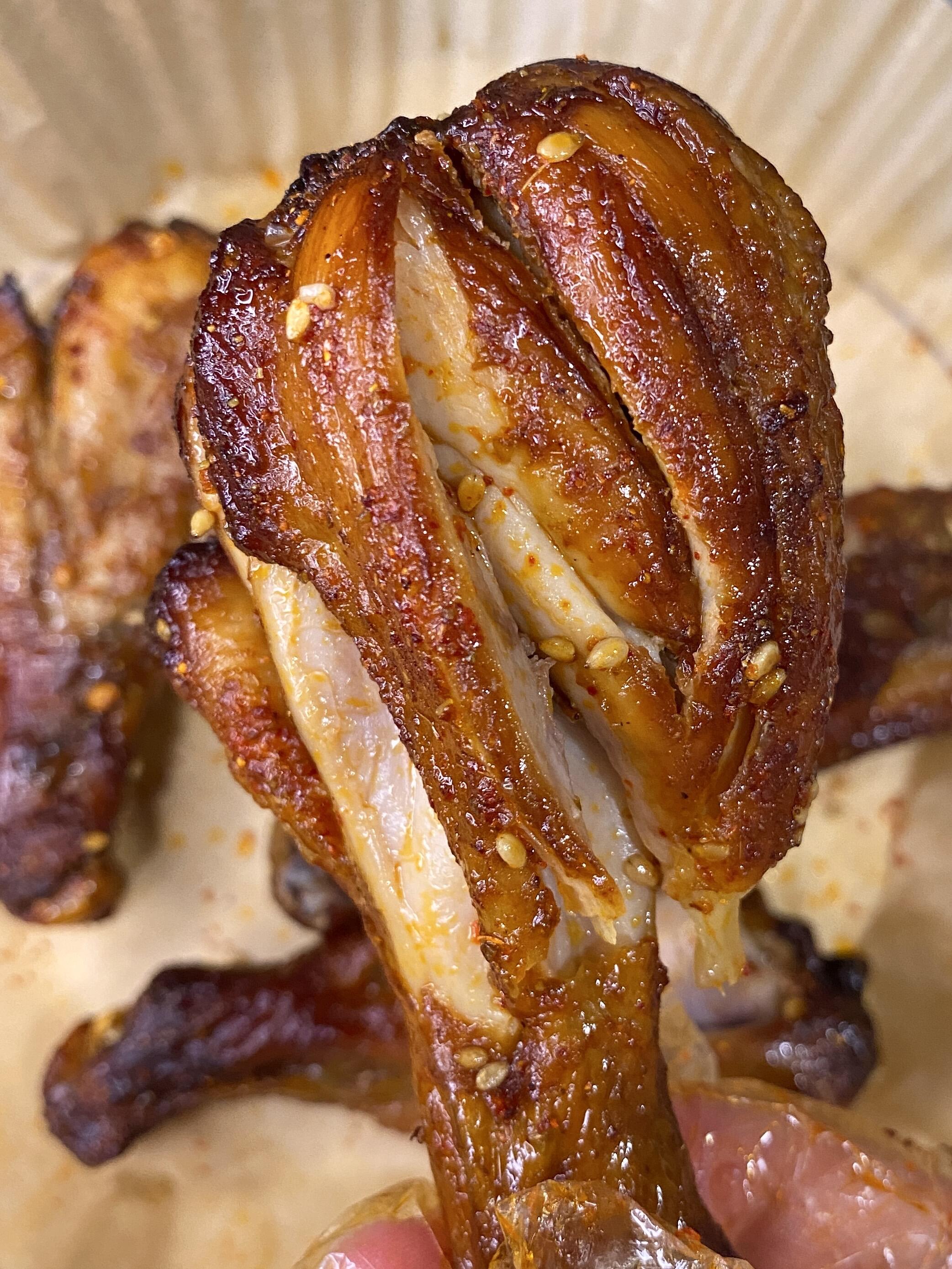 15分钟后,打开空气炸锅,把鸡腿翻个面。这时候能看到鸡腿的一面已经烤得金黄酥脆,翻面后继续烤8分钟。翻面烤能让鸡腿的另一面也变得同样酥脆,而且能保证鸡肉内部熟透。
