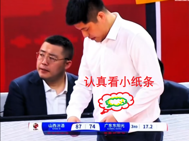 值得一提的是,在比赛中,我们可以发现,潘江时不时,拿出一张小纸条来看,那么,这个小纸条是哪里来的呢?写的是什么内容呢?也是让球迷十分好奇。有球迷猜测表示这是李春江给的锦囊妙计,是山西队赢球的秘密。