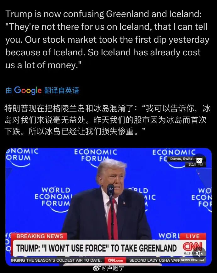 美国总统特朗普在瑞士达沃斯向世界领导人发表讲话时,多次将格陵兰岛误称为冰岛,但白宫对此予以强烈否认。