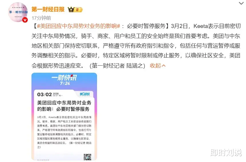 美团旗下国际外卖品牌Keeta已明确表态,必要时将暂停中东地区服务。据第一财经3月2日报道,Keeta官方对外回应,当前正密切跟踪中东地区安全局势,将骑手、商家、用户与本地员工的安全放在首位。这不是一句公关话术,而是一家全球化即时零售平台,在极端不确定性下的底线选择。