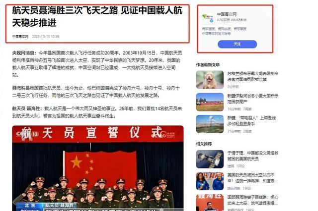 信源:中国青年网2023.10.15——航天员聂海胜三次飞天之路 见证中国载人航天稳步推进