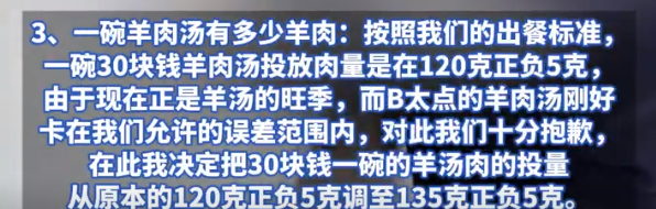 而对于B太对“羊汤太白”的疑问,该工作人员解释:“企业熬制时有它的秘方,有些下面放了羊小腿骨、中间是羊排、上面是羊油和羊肉,加了羊油就会比较白。我听说白汤是因为以前经济困难,大家喜欢喝油大一点的,那是老配方;现在人口味变淡了,喜欢喝清汤和红汤了。”而白色的羊汤因为油重,在当地深受体力劳动者的喜爱,因为可以提供更多的热量。