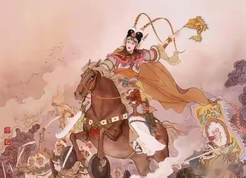 就这样,53岁的穆桂英当了先锋,快一百岁的佘太君挂了帅。这十二寡妇里头,每个人都有自己的血泪史。除了穆桂英,还有大郎的妻子张金定、二郎的妻子耿金花、三郎的妻子董月娥、四郎的妻子罗氏女(演义里是铁镜公主)、五郎的妻子马赛英、六郎的妻子柴郡主、七郎的妻子杜金娥,加上杨宗保的妹妹杨八姐、杨九妹,还有烧火丫头杨排风。柴郡主贵为皇室后裔,本可以安享富贵,却跟着婆婆和妯娌们一起上了战场。杨排风原本只是天波府里一个烧火的丫头,因为天生神力,被佘太君收为义女,练就了一手火棍绝技,在这场战役里也冲在最前面。