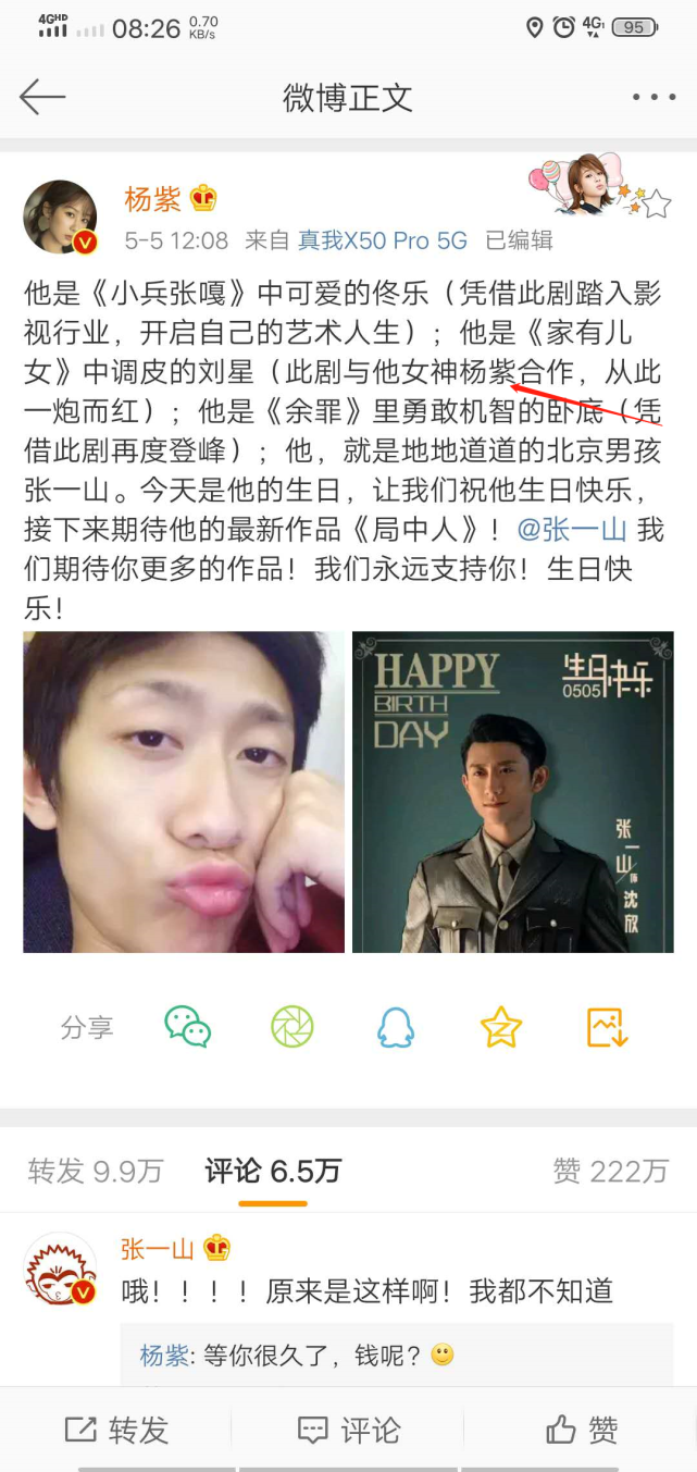 这篇微博我们也可以看的出杨紫真的在为我们的一山哥着想,又是推了他以前的局,更是在帮张一山的新剧做宣传,不过言行中也是在逗张一山,那句跟他女神杨紫合作,可以看出他们两个之间的感情是真的很棒。