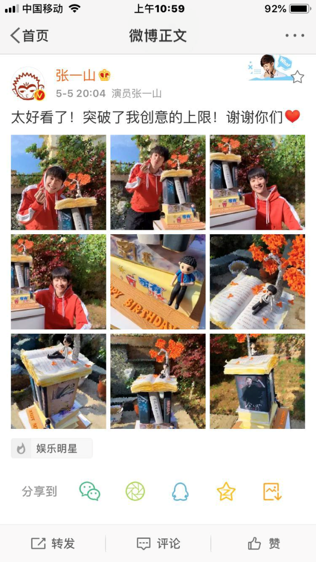 而今年的用心礼物,真的花了很多心思,大家可以看的出,那个蛋糕就是由一本本书籍做出来的,可以看的到张一山以前的电视剧都以这样的形式出现在了蛋糕上面,家有儿女,春风十里,余罪等等,张一山更是发微博直呼太好看了,满满的感动。