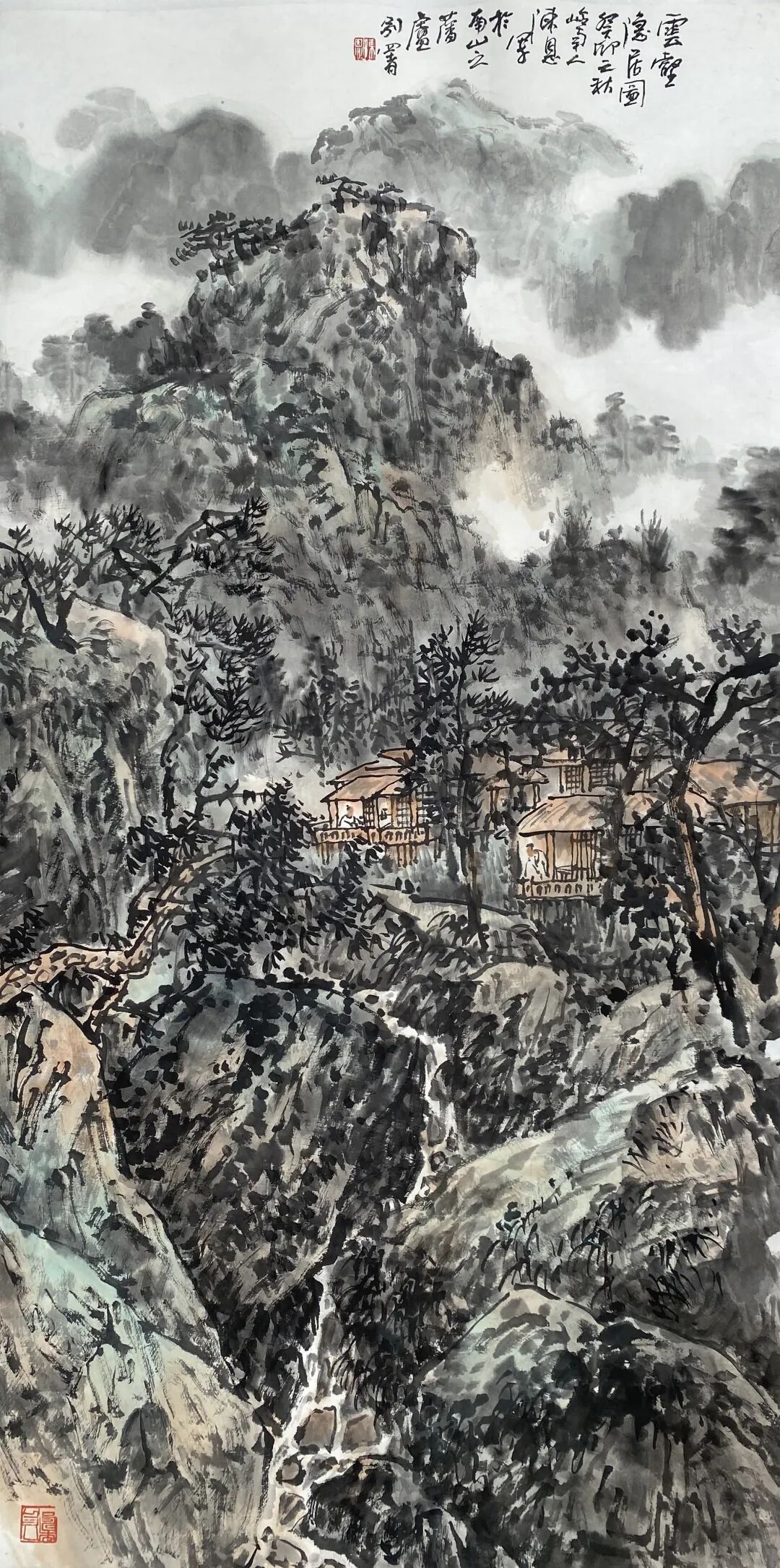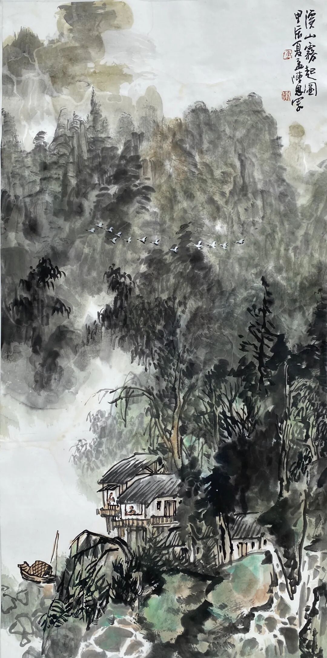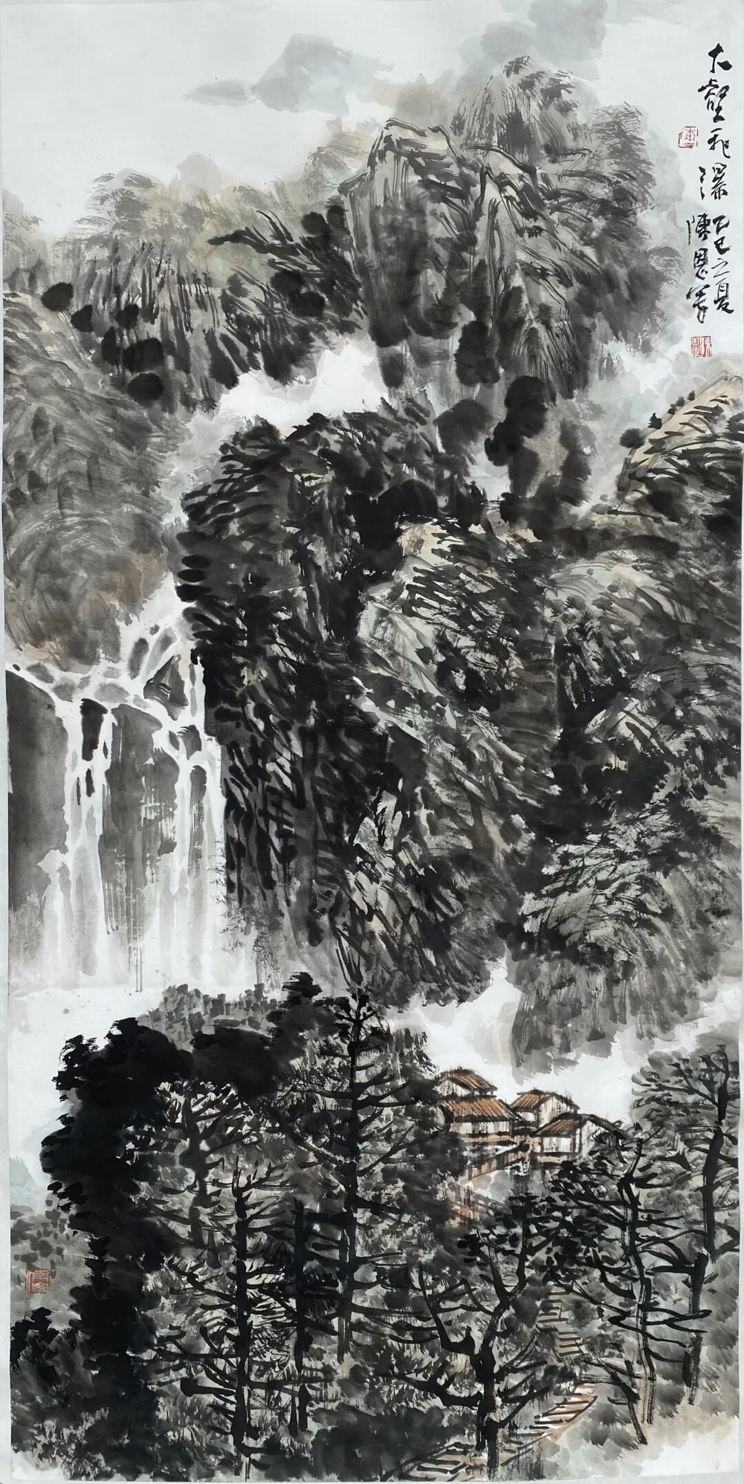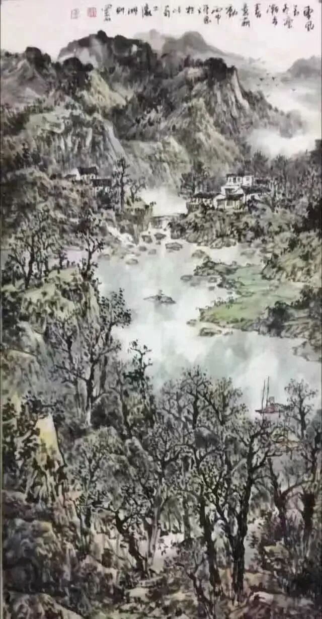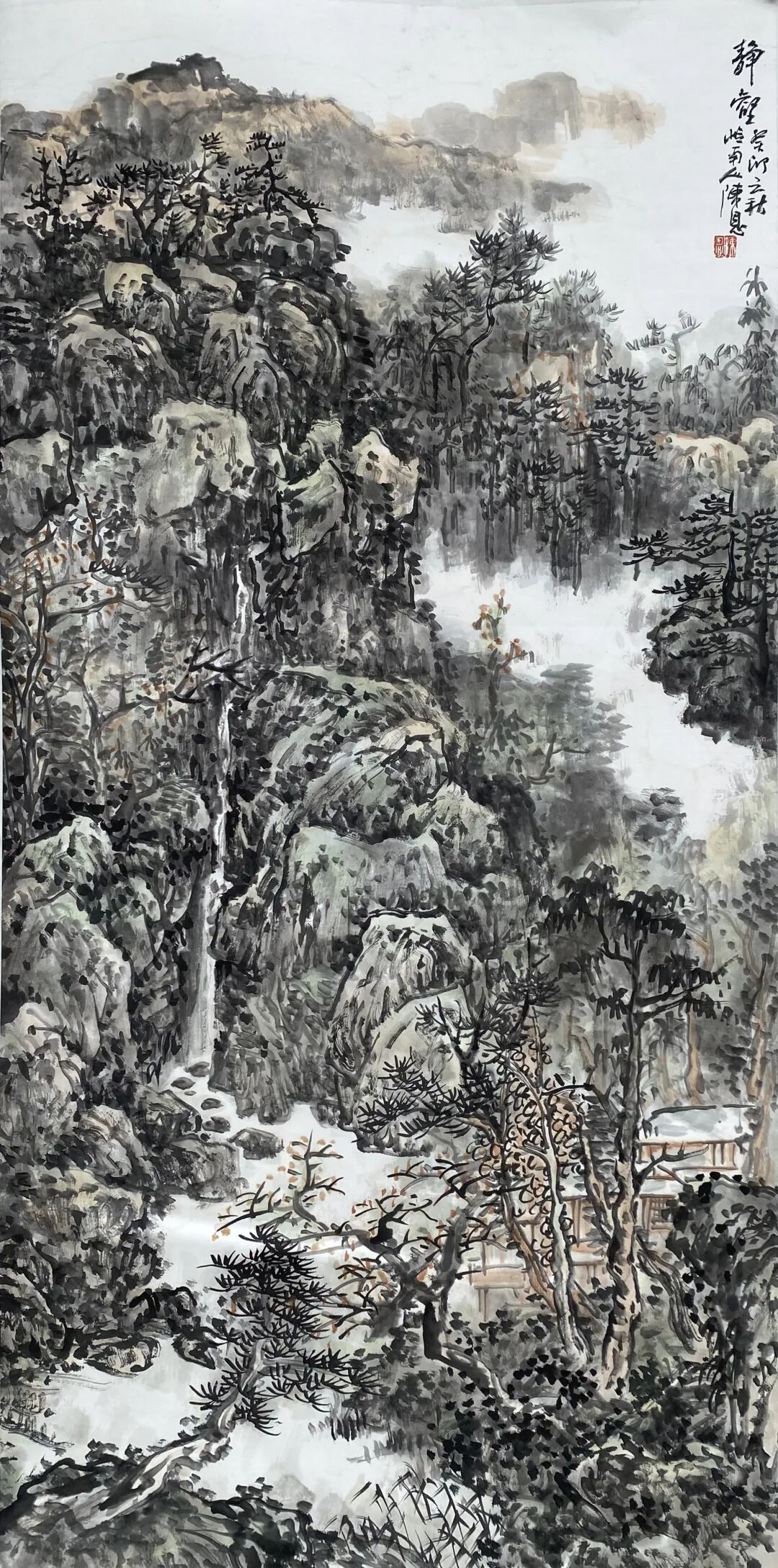 在笔墨语言的探索上,陈恩早已臻于成熟。他深耕传统,对笔、墨、意、韵的拿捏精准而自如,在继承中国画文脉的基础上,更以个性化的艺术表达凸显审美追求。其作品中的意象选择与意境营造,皆经过深思熟虑的淬炼:密林繁树苍劲挺拔,烟云雾霭氤氲流转,重山叠水层峦叠嶂,共同构筑出一个和谐纯净、幽深灵动且内蕴生机的视觉空间。在这个空间里,传统文脉的厚重、山水精神的空灵,与画家的深层心境、内在意识相互交织,达成了精神与物象的高度契合。