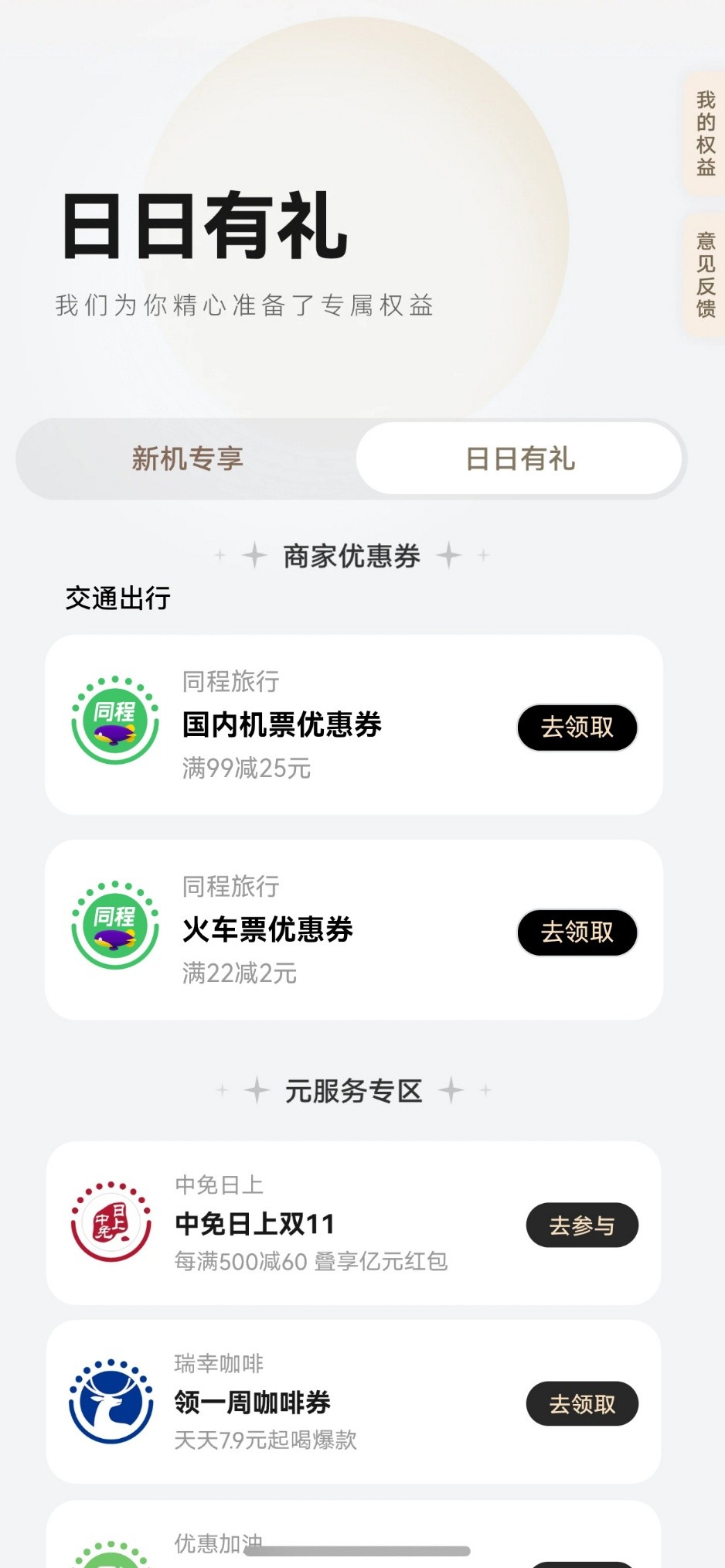 对了,快捷工具区还有个“鸿蒙有礼”,我在里面领到了不少现金红包和元服务优惠券,用元服务预订行程、买咖啡,都能省点小钱,也算是给奔波日子一点小奖励。如果你是从老系统升级到HarmonyOS 5.1及以上系统的用户,或者是华为三折叠手机和指定华为平板的新用户,”鸿蒙有礼”的福利会更多,记得去逛逛哦。。