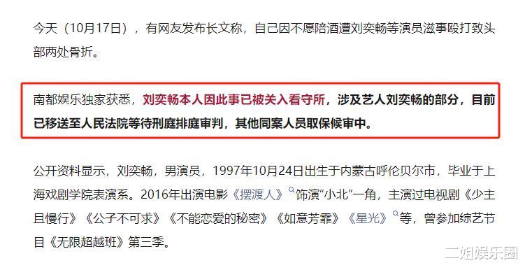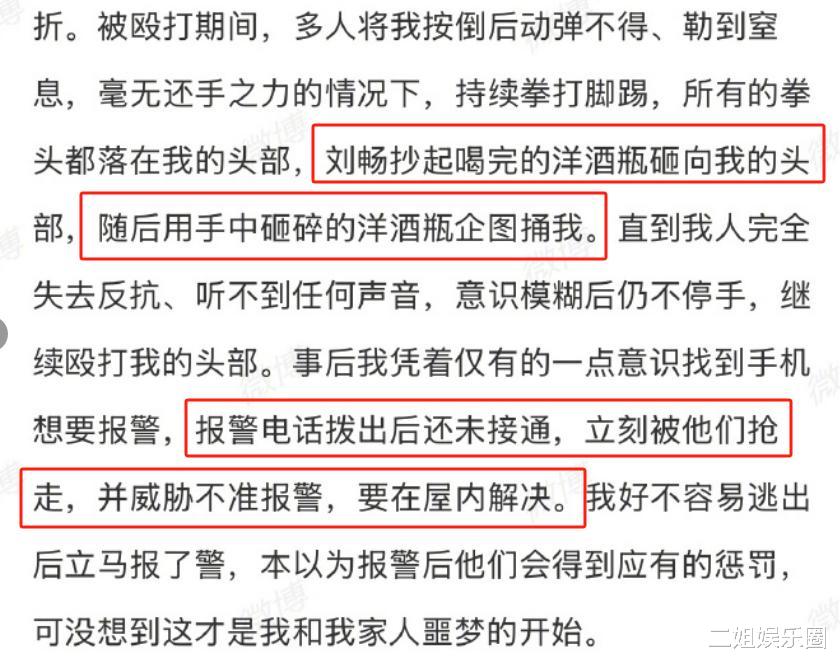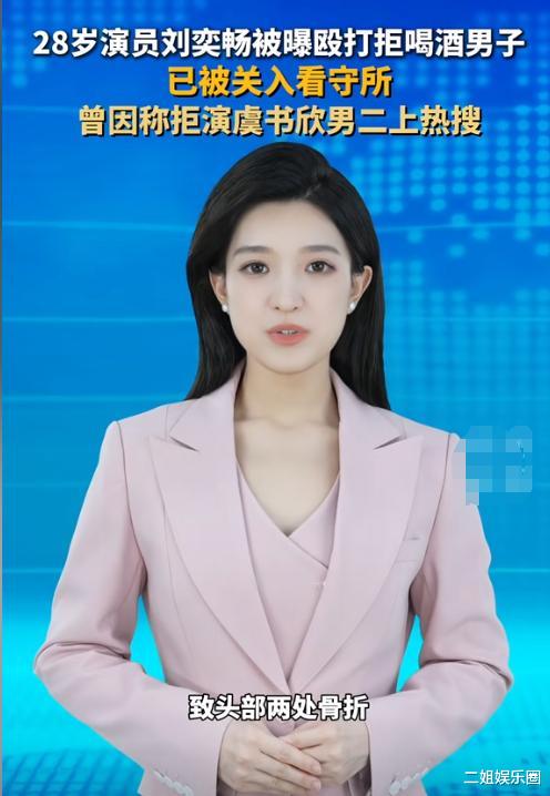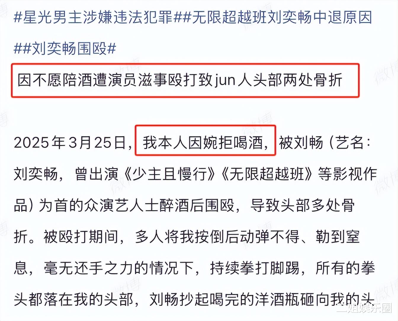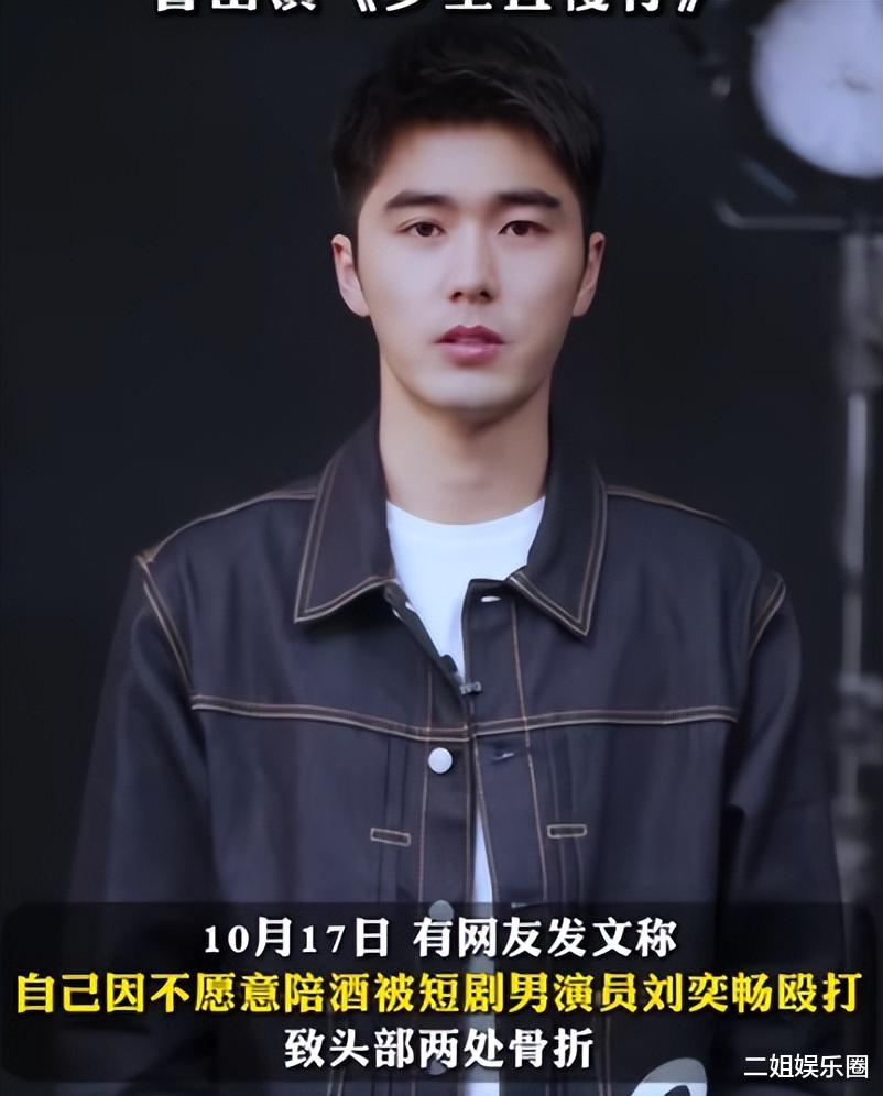 一位网友控诉,自己因为拒绝陪酒,被演员刘奕畅等人酒后围殴,导致头部骨折。
